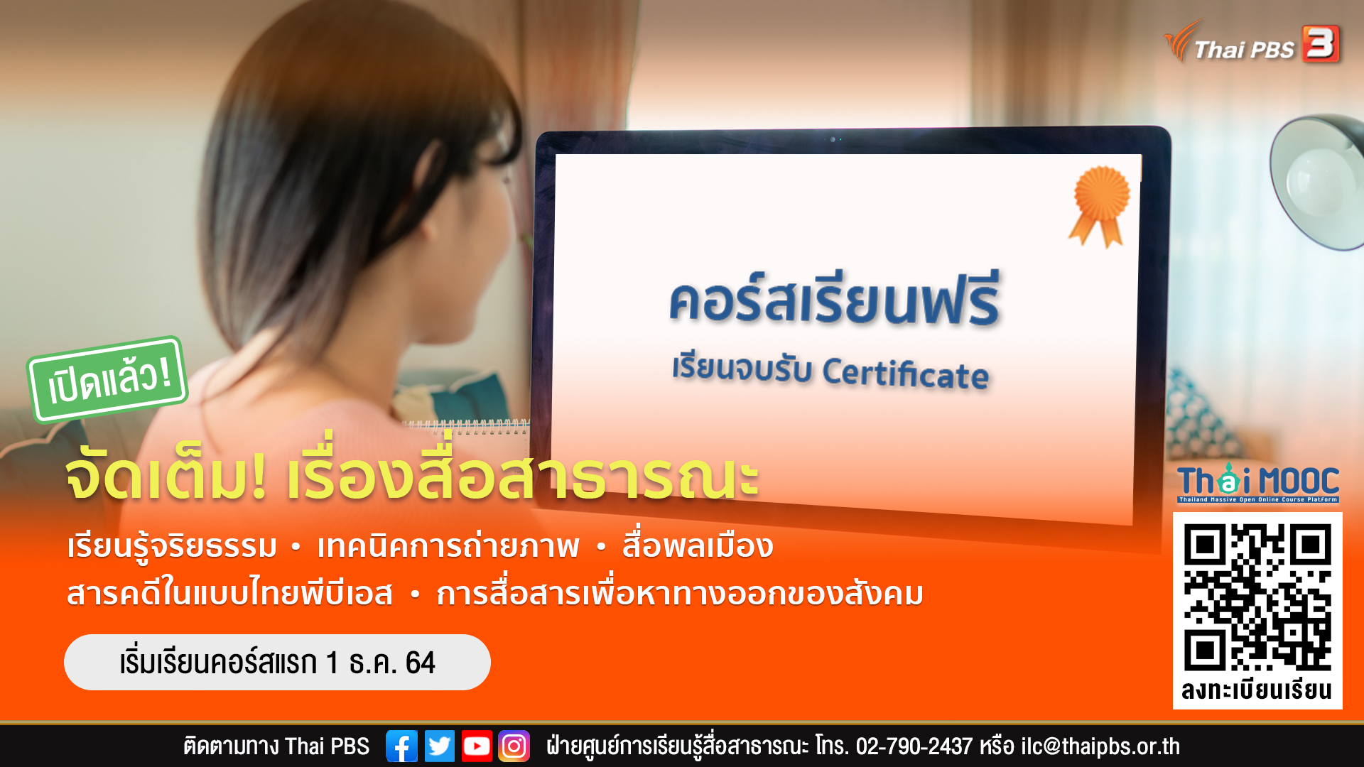 ไทยพีบีเอส ชวนทุกคนมาเติมเต็มความรู้กับคอร์สเรียนออนไลน์ “Thai PBS MOOC” พร้อมอัดแน่นความรู้ด้านสื่อสาธารณะ ที่หลายคนอาจมองว่าเป็นเรื่องยาก โดยปรับรูปแบบการเรียนใหม่ให้กลายเป็นเรื่องง่าย ๆ กว่า 5 รายวิชา ที่เป็นประโยชน์ สามารถต่อยอดกับการทำงานได้จริง กับวิชาจริยธรรมและวิชาชีพสื่อมวลชน เทคนิคการถ่ายภาพแบบสื่อสาธารณะ สื่อพลเมือง งานสื่อสารสาธารณะเพื่อหาทางออกของสังคม และการทำสารคดีในแบบสื่อสาธารณะ พร้อมเรียนรู้ฟรีแบบไม่มีค่าใช้จ่าย ตลอด 24 ชั่วโมง