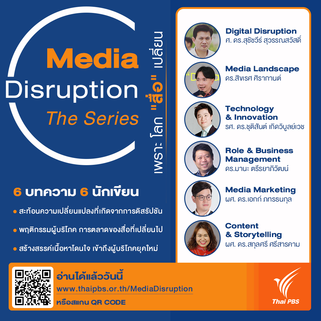 ไทยพีบีเอส ชวนอ่าน Media Disruption The Series เพราะ โลก “สื่อ” เปลี่ยน หนังสือที่สะท้อนให้เห็นถึงความเปลี่ยนแปลงที่เกิดจากการดิสรัปชัน รวมถึงการทำความเข้าใจพฤติกรรมผู้บริโภคและการตลาดของสื่อที่เปลี่ยนไป พร้อมสร้างสรรค์เนื้อหาที่ตอบโจทย์ โดนใจ และเข้าถึงผู้บริโภคยุคใหม่ จาก 6 ผู้เชี่ยวชาญด้านสื่อสารมวลชน เทคโนโลยี และการตลาด