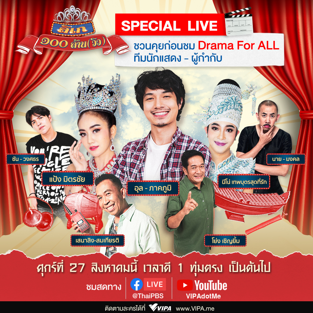 มาร่วมคุยยกคณะกับกิจกรรมสุดพิเศษ SPECIAL LIVE ชวนคุยก่อนชม “ลิเก ๑๐๐ ล้าน (วิว)” เตรียมพบกับคณะลิเก “รพินทร์ กังวาลไพร” จากละครมิติใหม่ใน โปรเจกต์ DRAMA FOR ALL นำทีมโดยผู้กำกับ เสนาลิง-สมเกียรติ จันทร์พราหมณ์ พร้อมทัพนักแสดงมากมาย นำโดย อุล-ภาคภูมิ, แป้ง มิตรชัย, นีโน่ เทพบุตรสุดที่รัก, น้าโย่ง เชิญยิ้ม, ซัน-วงศธร และ นาย-มงคล