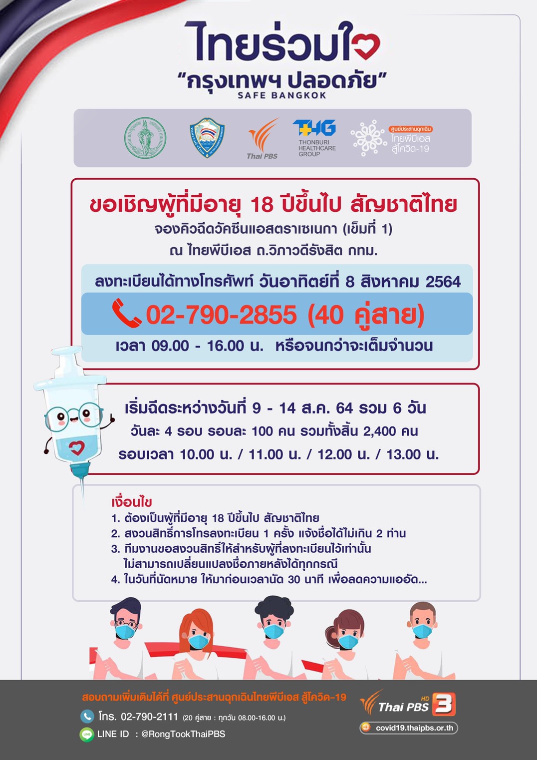 ไทยพีบีเอส-ธนบุรีฯ” เปิดจองคิวฉีดวัคซีนอายุ 18 ปีขึ้นไป ลงทะเบียนทางโทรศัพท์ 8 ส.ค.นี้