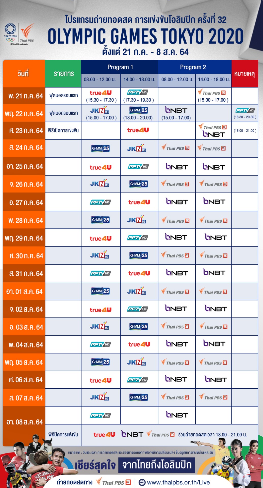 เปิดฉากต้อนรับการแข่งขันในมหกรรมกีฬาที่ยิ่งใหญ่ที่สุดของมวลมนุษยชาติ “โอลิมปิกเกมส์ โตเกียว 2020” ซึ่งเป็นมหกรรมการแข่งขันกีฬาที่คนทั้งโลกต่างเฝ้ารอคอยอย่างมีความหวัง และกำลังจะกลับมาสร้างปรากฏการณ์ครั้งใหม่แห่งวงการกีฬาระดับโลก ท่ามกลางสถานการณ์สุดท้าท้ายในขณะนี้ โดย ไทยพีบีเอส ซึ่งเป็นสื่อสาธารณะแห่งแรกและแห่งเดียวในประเทศไทย ขอร่วมเป็นส่วนหนึ่งในการถ่ายทอดสดมหกรรมกีฬาสุดยิ่งใหญ่ที่รวมใจคนทั้งโลก ระหว่างวันที่ 21 กรกฎาคม – 8 สิงหาคม 2564 ตั้งแต่เวลา 08.00 – 12.00 น. และ 14.00 – 18.00 น. ทางไทยพีบีเอส และเว็บไซต์ไทยพีบีเอส www.thaipbs.or.th/Live