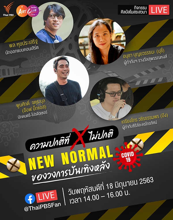 ไทยพีบีเอสขอเชิญชวนผู้ที่สนใจร่วมรับชมกิจกรรม ศิลป์สโมสรเสวนา LIVE “New Normal ความปกติที่ ❌ ไม่ปกติ ของวงการบันเทิงหลังโควิด-19” ในวันพฤหัสบดีที่ 18 มิถุนายน 2563 เวลา 14.00 – 16.00 น. ทาง Facebook @ThaiPBSfan และทาง Facebook : ไทยบันเทิง ThaiPBS
