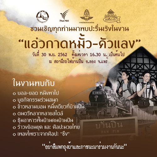 ภายในงานพบกับ บอล-ยอด จากรายการหนังพาไป ที่จะมาร่วมแบ่งประสบการณ์จากการเดินทางแบบเป็นกันเอง เพื่อร่วมกันค้นหาและเรียนรู้ความหมายจากการเดินทาง รวมถึงแนวทางการอนุรักษ์สถานีรถไฟเก่า “สถานีรถไฟบ้านปิน” อายุกว่า 100 ปี ในปัจจุบันสถานีรถไฟบ้านปินกลายเป็นจุดเช็กอินของนักท่องเที่ยว และเป็นพื้นที่ที่สามารถขับเคลื่อนเศรษฐกิจในชุมชนได้อีกแห่งหนึ่ง เพื่อนำไปสู่แนวทางการอนุรักษ์อาคารสถานีรถไฟหรือชุมชนเก่าอื่น ๆ ในยุคที่มีการพัฒนาทางด้านเทคโนโลยี และความเจริญก้าวหน้าเข้ามามีบทบาทสำคัญ พร้อมร่วมเรียนรู้วิถีชีวิต ศิลปวัฒนธรรมผ่านรูปแบบงานท้องถิ่น อาทิ อาหารพื้นบ้าน ดนตรีพื้นถิ่น รำวงย้อนยุค และศิลปะมวยไทยภาคเหนืออีกด้วย ผู้ที่สนใจสามารถมาร่วมงานได้ฟรี!! และร่วมติดตามภาพบรรยากาศได้ที่ www.faceboook.com/ThaiPBSFan