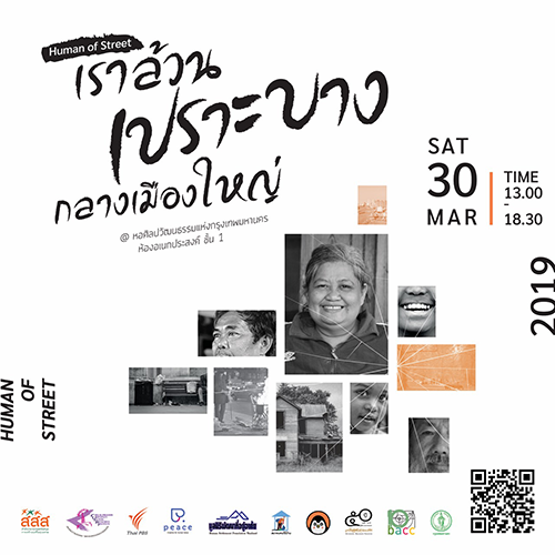 เมื่อความ “ไร้บ้าน” ไม่ใช่แค่เรื่องของที่อยู่อาศัย แต่เป็นสภาวะเปราะบางที่เกิดขึ้นกับใครก็ได้ และดูจะรุนแรงมากขึ้นในพื้นที่ที่เป็น “เมืองใหญ่” สถานีโทรทัศน์ไทยพีบีเอสจึงร่วมกับ 8 หน่วยงานพันธมิตร ได้แก่ สสส. , สถาบันวิจัยสังคม จุฬาลงกรณ์มหาวิทยาลัย, มูลนิธิพัฒนาที่อยู่อาศัย, เครือข่ายธุรกิจเพื่อสังคมและสิ่งแวดล้อม(SVN), สมาคมคนไร้บ้าน, Peace Creative for Human Value, มูลนิธิเสฐียรโกเศศ-นาคะประทีป และหอศิลปวัฒนธรรมแห่งกรุงเทพมหานคร ขอเชิญทุกท่านร่วมงาน “Human of Street : เราล้วนเปราะบางกลางเมืองใหญ่” นิทรรศการเพื่อความเข้าใจคนไร้บ้านในฐานะเพื่อนมนุษย์คนหนึ่ง ที่จะพาทุกคนไปรับรู้ถึงสถานการณ์ที่เปราะบางกับตัวเรา เพื่อการดูแลตัวเองและคนใกล้ตัวไม่ให้ตกไปอยู่ในสภาวะเปราะบาง ในวันเสาร์ที่ 30 มีนาคม 2562 เวลา 13.00 – 18.30 น. ณ ห้องเอนกประสงค์ ชั้น 1 หอศิลปวัฒนธรรมแห่งกรุงเทพมหานคร (BACC)