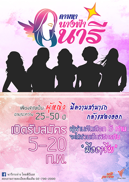 ไทยพีบีเอส ขอเชิญสาว ๆ อายุระหว่าง 25 – 50 ปี สมัครเข้าร่วมกิจกรรม “ตามหา นางฟ้านารี” ผู้ผ่านการคัดเลือก 5 ท่าน จะได้ร่วมเป็นพิธีกรกับ “มืออาชีพ” ในรายการนารีกระจ่าง ซึ่งออกอากาศทุกวันจันทร์ – ศุกร์ เวลา 09.05 น. ทางไทยพีบีเอส