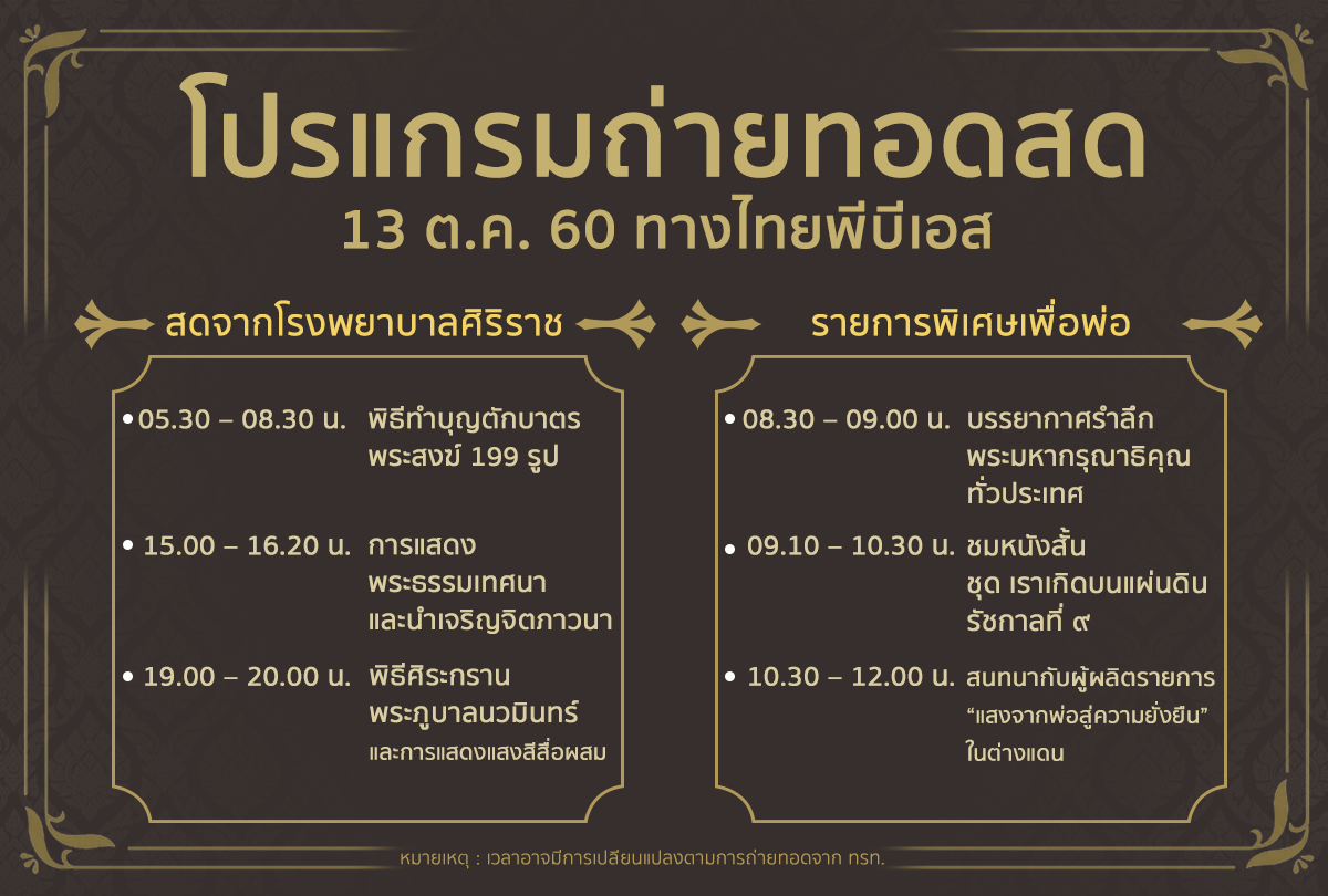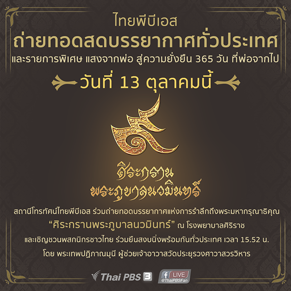 365 วัน ความอาลัยไม่เคยจางหาย คนไทยจะรวมใจเป็นหนึ่ง น้อมรำลึกในพระมหากรุณาธิคุณของในหลวง รัชกาลที่ 9 สถานีโทรทัศน์ไทยพีบีเอส จัดรายการพิเศษ “แสงจากพ่อ สู่ความยั่งยืน 365 วันที่พ่อจากไป” และถ่ายทอดสดบรรยากาศงาน “ศิระกรานพระภูบาลนวมินทร์” จากโรงพยาบาลศิริราช ในวันศุกร์ที่ 13 ตุลาคม 2560