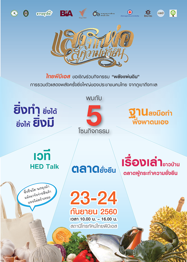 สถานีโทรทัศน์ไทยพีบีเอส ร่วมกับเครือข่ายภาคประชาชน ขอเชิญร่วมงาน “แสงจากพ่อ…สู่ความยั่งยืน ตอน พลังแผ่นดิน” การรวมตัวแสดงพลังครั้งยิ่งใหญ่ของประชาชนคนไทย จากภูเขาถึงทะเล เพื่อน้อมรำลึกและแสดงความอาลัยแด่ในหลวง รัชกาลที่ 9 ในวันที่ 23 – 24 กันยายน 2560 เวลา 10.00 น. – 16.00 น. ณ สถานีโทรทัศน์ไทยพีบีเอส ถ.วิภาวดีรังสิต (แผนที่) ภายในงานพบกับ 5 โซนกิจกรรม