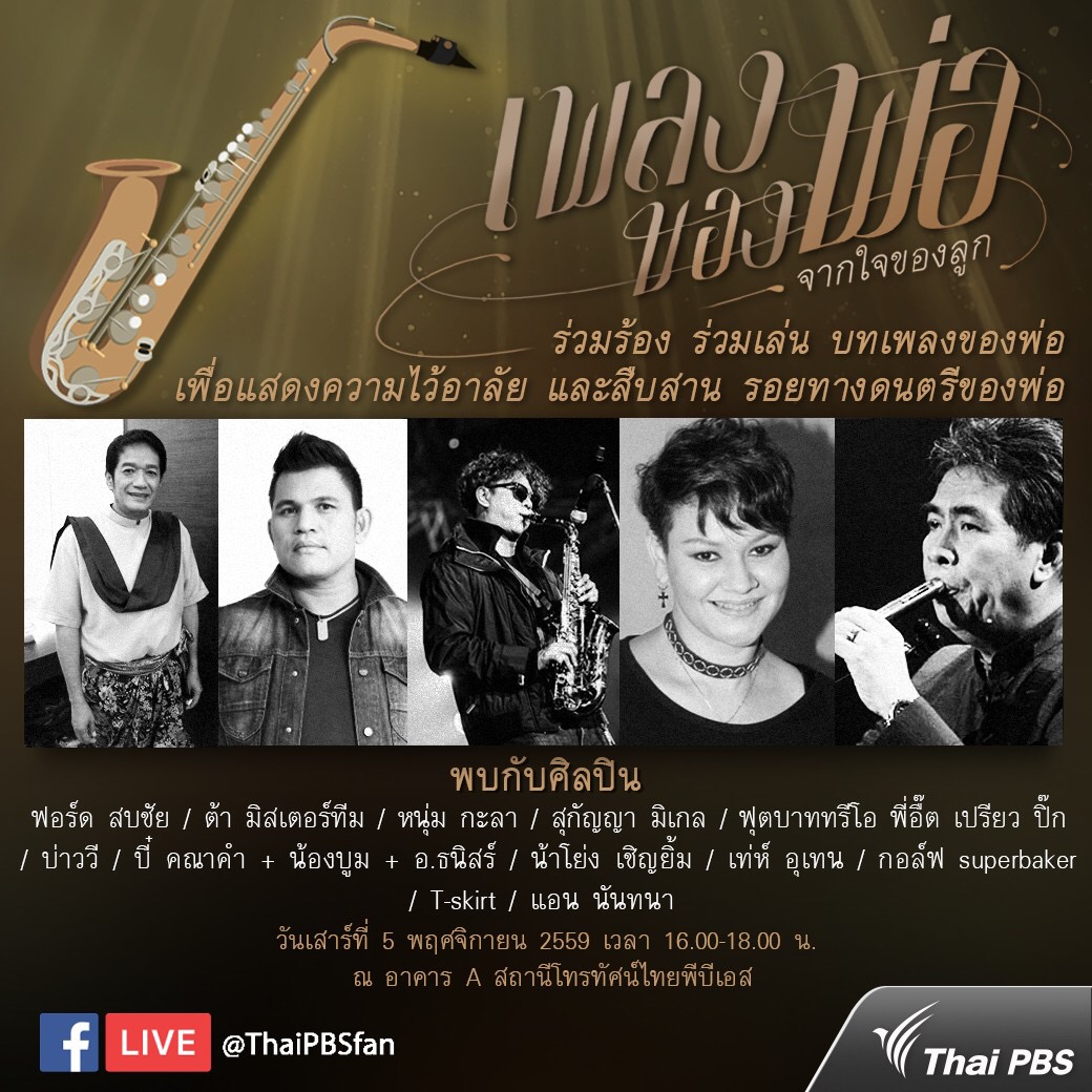 5 พ.ย. นี้ ชมพรี!! ศิลปินรวมใจ ร่วมร้อง ร่วมเล่น บทเพลงของพ่อ ตั้งแต่เวลา 16.00 – 18.00 น. ณ สถานีโทรทัศน์ไทยพีบีเอส