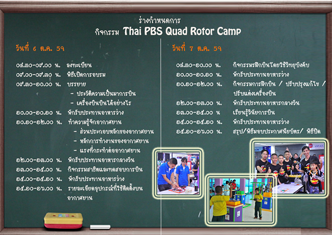 ไทยพีบีเอสต้อนรับปิดเทอม ชวนน้องๆ อายุ 10-15 ปี ร่วมกิจกรรม “Thai PBS Mini Quad Rotor Camp” มาทำความรู้จัก ประดิษฐ์ และทดสอบการใช้งานอากาศยาน พร้อมเข้าฐานฝ่าด่านความยากกับ อ. พิศิษฐ์ มิตรเกื้อกูล นายกสมาคมกีฬาเครื่องบินจำลองและวิทยุบังคับ พร้อมพี่ๆ ทีมงานหนูน้อยจ้าวเวหาไทยพีบีเอส
