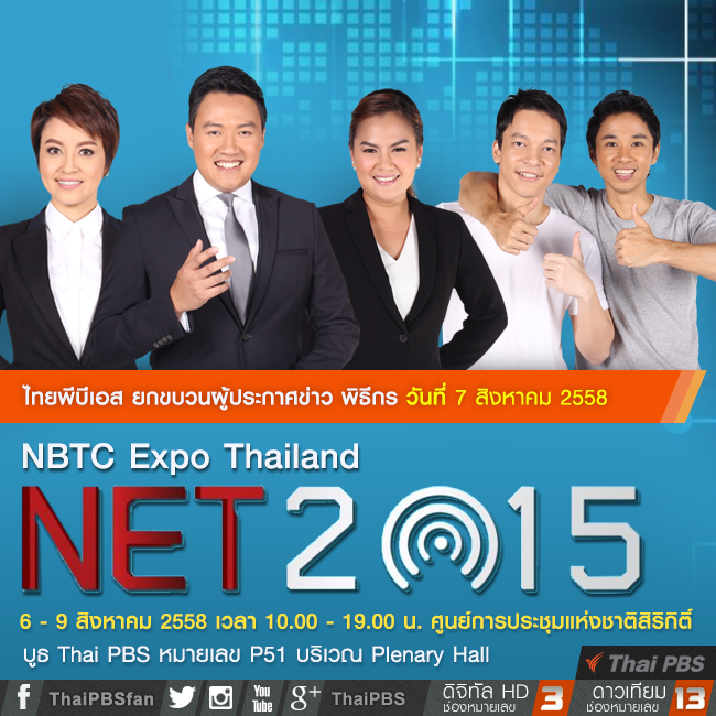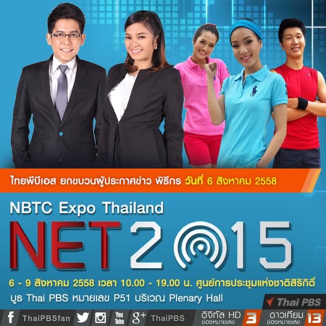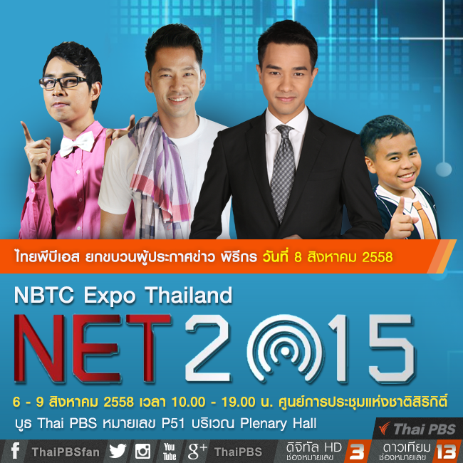 ไทยพีบีเอส เชิญชวนร่วมงาน NBTC Expo Thailand : NET 2015 ก้าวสู่อนาคตโลกดิจิตอล The Future Trend in Digital World ระหว่างวันที่ 6 – 9 สิงหาคม เวลา 10.00 – 19.00 น. ศูนย์การประชุมแห่งชาติสิริกิติ์ พบกับบูธไทยพีบีเอสได้ที่ P51 Plenary Hall 3 ภายในงานพบกับ กิจกรรมทดลองอ่านข่าวกับผู้ประกาศข่าวมืออาชีพ ด้วยเทคนิคการนำเสนอข่าวเสมือนจริง (Immersive Graphic) และครั้งแรกกับประสบการณ์ห้องมืด เพื่อเรียนรู้ระบบเสียงบรรยายภาพสำหรับผู้พิการทางสายตา (Audio Description) พร้อมพบกับพิธีกร ผู้ดำเนินรายการ ผู้ประกาศข่าว อาทิ บอย AF- สิทธิชัย ผาบชมพู, บอล-ยอดจากรายการหนังพาไป,ฟูจิ ฟูจิซากิ จากรายการดูให้รู้, เต๋า-ณัฐฐา โกมลวาทิน, จอร์ช-วราวิทย์ ฉิมมณี มาร่วมสนุกเล่นเกมแจกของรางวัลมากมาย