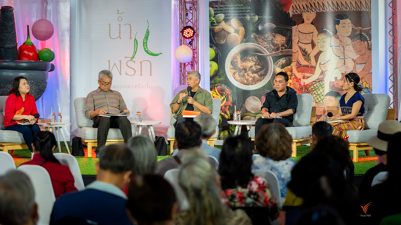 ในการเสวนามี คุณอนุสรณ์ ติปยานนท์ นักเขียน และ Food Activist ผู้เขียนหนังสือ “น้ำพริก มรดกรสแห่งเครื่องจิ้ม”, คุณจิรัศยา บุญคน แม่ครัวชาวกะเหรี่ยง จากหนองหญ้าปล้อง จ.เพชรบุรี ได้มาแบ่งปันเรื่องราวน้ำพริกสูตรเด็ดที่ใช้พริกพรานและพริกกะเหรี่ยง คุณเสรี รุ่งสว่าง นักร้องลูกทุ่งชื่อดัง เจ้าของบทเพลง “เทพธิดาผ้าซิ่น” #ตำน้ำพริกทุกทีเสียงตำถี่จนทุ่งสะเทือน เล่าถึงน้ำพริกถ้วยโปรดอย่าง “น้ำพริกกะปิแนมผักบุ้งดองสด” ของกินถิ่นบางปลาม้า จ.สุพรรณบุรี, รศ.ดร.ชาติชาย มุกสง อาจารย์ประจำภาควิชาประวัติศาสตร์ คณะสังคมศาสตร์ มหาวิทยาลัยศรีนครินทรวิโรฒ ที่ช่วยเสริมแง่มุมประวัติศาสตร์น้ำพริก ในห้วงเวลาที่มีการเปลี่ยนแปลงรสชาติอาหาร และคุณพรรณี รุ่งสว่าง ผู้อำนวยการศูนย์สื่อศิลปวัฒนธรรม ไทยพีบีเอส ดำเนินรายการ