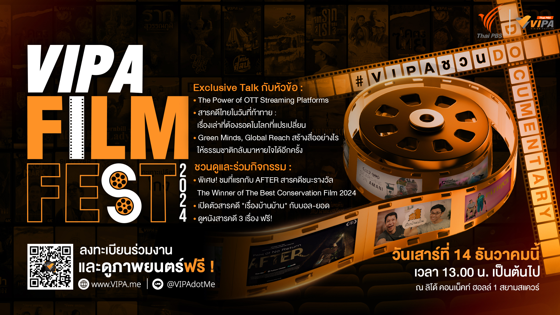VIPA By Thai PBS จัดเทศกาลรวมพลคนรักหนังสารคดีในงาน VIPA Film Fest 2024 เปิดพื้นที่ให้ผู้ที่ชื่นชอบภาพยนตร์สารคดีได้ร่วมรับชมสารคดีคุณภาพ พร้อมเปิดวงเสวนาโดยผู้เชี่ยวชาญ 8 ท่านใน 2 หัวข้อ เพื่อเป็นการสร้างแรงบันดาลใจให้กับผู้ผลิตภาพยนตร์สารคดีและกลุ่มคนรุ่นใหม่ ได้ร่วมตระหนักถึงปัญหาสิ่งแวดล้อม วิถีชีวิต และสังคมปัจจุบัน ในวันเสาร์ที่ 14 ธันวาคม 2567 ณ ลิโด้ คอนเน็คท์ ฮอลล์ 1 สยามสแควร์