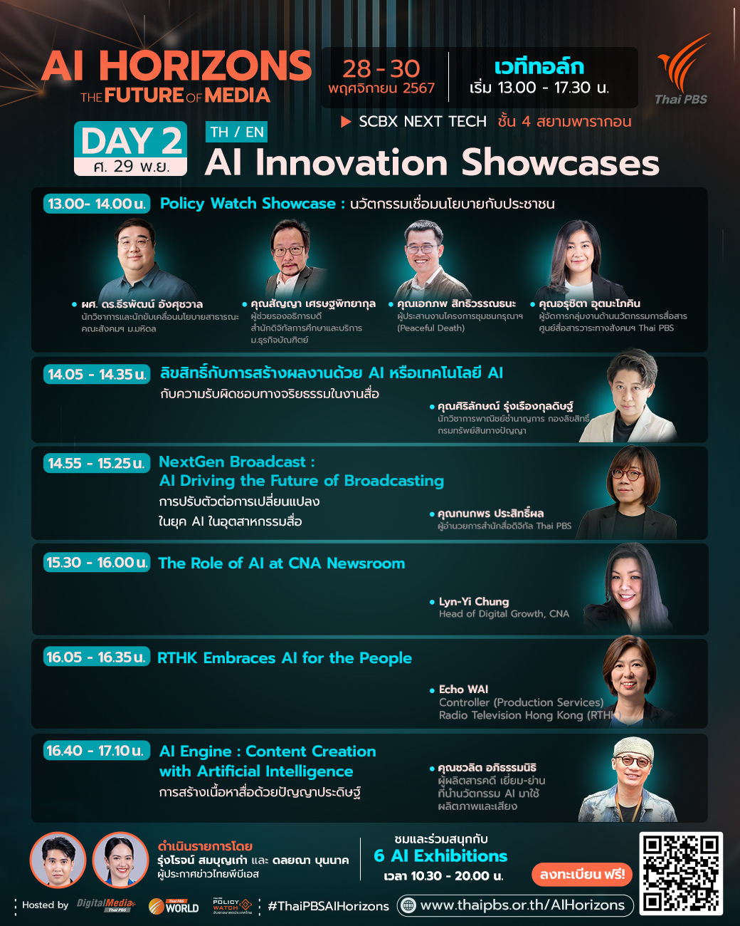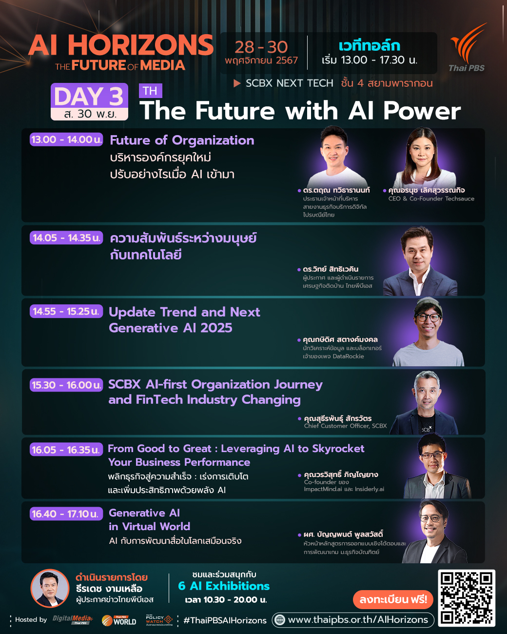 ไทยพีบีเอส เชิญชวนผู้สนใจร่วมงาน “AI Horizons: The Future of Media เมื่อโลกของสื่อ..ต้องพลิกโฉมด้วยพลัง AI” ร่วมอัปเดตเทคโนโลยี AI เพื่อการเรียนรู้ และประยุกต์ใช้ให้เกิดประโยชน์อย่างรู้เท่าทัน ในการนำนวัตกรรมเทคโนโลยี AI มาใช้ในหลากหลายอุตสาหกรรม โดยมีกำหนดจัดขึ้นในระหว่างวันที่ 28 – 30 พ.ย. 67 ณ SCBX NEXT TECH ชั้น 4 สยามพารากอน