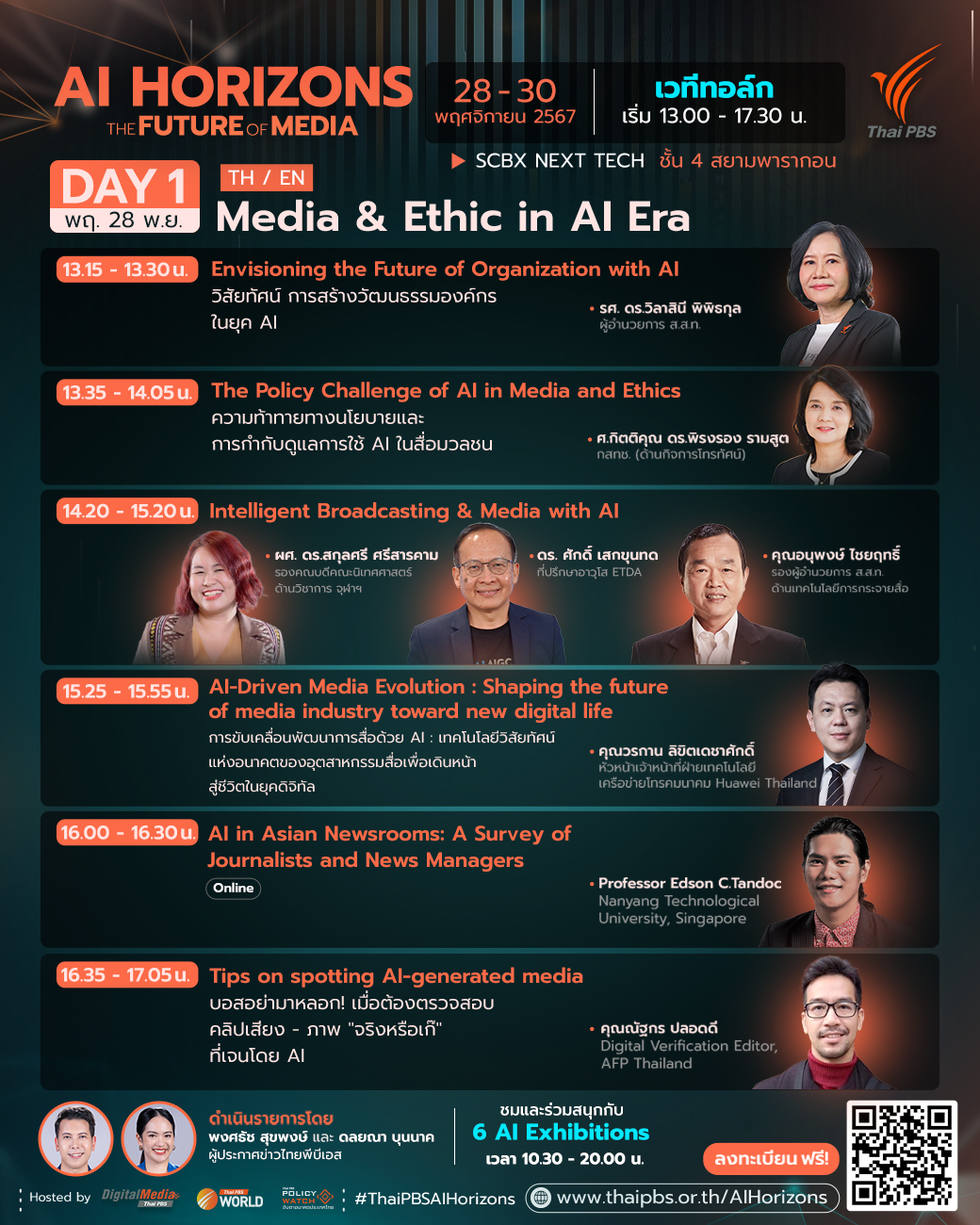 พร้อมด้วย AI Horizons Talk : เวทีเสวนาอัปเดตเทรนด์เทคโนโลยี AI และแลกเปลี่ยนความรู้เกี่ยวกับการใช้ AI จากวงการสื่อทั้งไทยและต่างชาติ รวมถึงภาคอุตสาหกรรมอื่น ๆ โดยวิทยากรแถวหน้าจากทั้งในประเทศและต่างประเทศ ตลอด 3 วัน 3 ธีม ได้แก่ Media & Ethic in AI Era ในวันที่ 28 พ.ย. 67 อาทิ ศ.กิตติคุณ ดร.พิรงรอง รามสูต, คุณวรกาน ลิขิตเดชาศักดิ์, Professor Edson C.Tandoc, คุณณัฐกร ปลอดดี AFP Thailand เป็นต้น