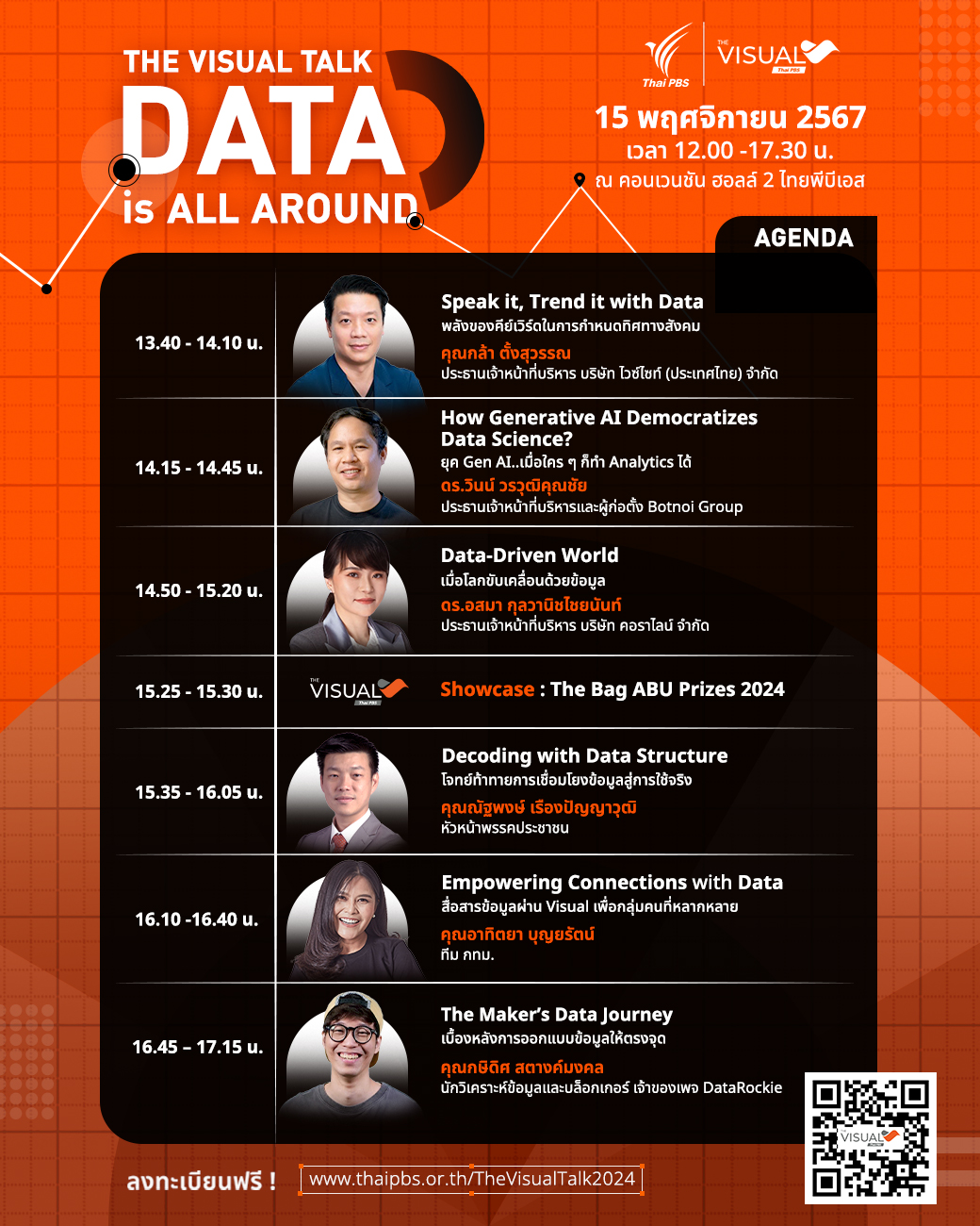 องค์การกระจายเสียงและแพร่ภาพสาธารณะแห่งประเทศไทย หรือไทยพีบีเอส จัดงาน The Visual Talk ภายใต้แนวคิด “Data is All Around” เพราะข้อมูลอยู่รอบตัวเรา เพื่อสร้างการรับรู้และเข้าใจ ถึงความสำคัญในการนำข้อมูล (Data) ไปใช้ในการขับเคลื่อนสังคมและการพัฒนารูปแบบการสื่อสาร และช่วยให้เข้าถึงข้อมูลที่ยากและซับซ้อนได้ง่ายขึ้น ที่นำเสนอผ่านมุมมองจาก 6 ผู้เชี่ยวชาญหลากหลายด้าน และสัมผัส 5 เรื่องเด่นของ The Visual by Thai PBS ทาง Data Visualization Exhibition ในวันศุกร์ที่ 15 พฤศจิกายน 2567 ตั้งแต่เวลา 12.00 – 17.30 น. ณ คอนเวนชัน ฮอลล์ 2 อาคาร D ไทยพีบีเอส ถนนวิภาวดีรังสิต กรุงเทพมหานคร (Google maps)