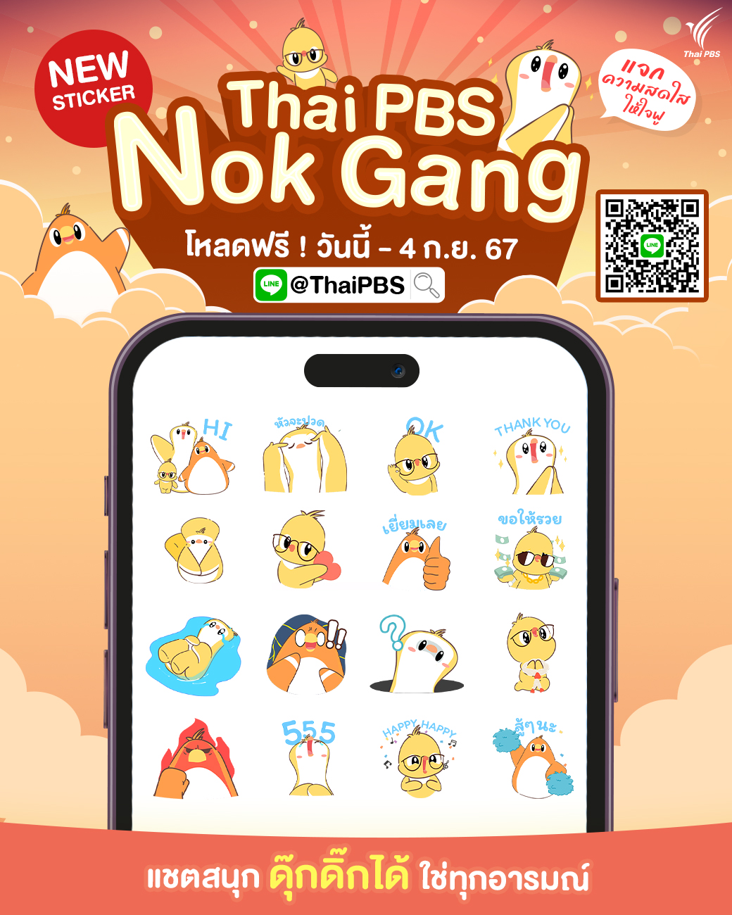 ชุดคำที่เข้าใจง่าย สะท้อนบุคลิกและอารมณ์ในวัตถุประสงค์ต่าง ๆ มีทั้งหมด 16 คาแรคเตอร์แบบแอนิเมชัน ต่อยอดความสำเร็จจากสติกเกอร์ Thai PBS Nok Gang ทั้ง 5 ชุดที่ผ่านมา นับเป็นเครื่องมือการสื่อสารที่สร้างความใกล้ชิดกับผู้ชม ผู้ฟังของไทยพีบีเอสมาอย่างต่อเนื่อง