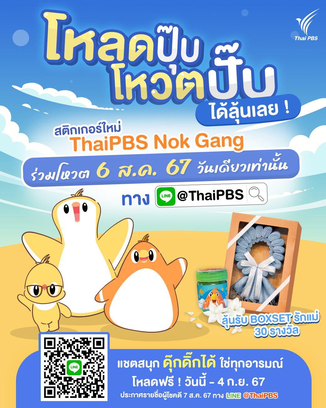 สุดพิเศษ! ต้อนรับวันแม่ Thai PBS Nok Gang ชุดใหม่ล่าสุด มีสติกเกอร์บอกรักแม่ ไว้ให้ทุกคนส่งหาคุณแม่ในวันแม่ที่กำลังจะมาถึงนี้อีกด้วย และยังคงความสดใส ขี้เล่น มีคำน่ารัก ๆ เป็นสติกเกอร์แทนใจคนทำงานไม่ว่าจะเป็น หัวจะปวด, OK, เยี่ยมเลย และสำหรับใครที่เป็นสายอวยพร มอบสิ่งดี ๆ ให้คนที่รักอย่าง ขอให้รวย, สู้ ๆ นะ, Happy Happy ก็มีให้เลือกใช้งานได้ตามความต้องการ สามารถดาวน์โหลดสติกเกอร์สุดน่ารักทั้งหมด 16 คาแรคเตอร์นี้ ได้ 30 วัน ตั้งแต่วันที่ 6 ส.ค. – 4 ก.ย. 67 หลังจากการดาวน์โหลด สามารถใช้งานได้ฟรี 90 วัน