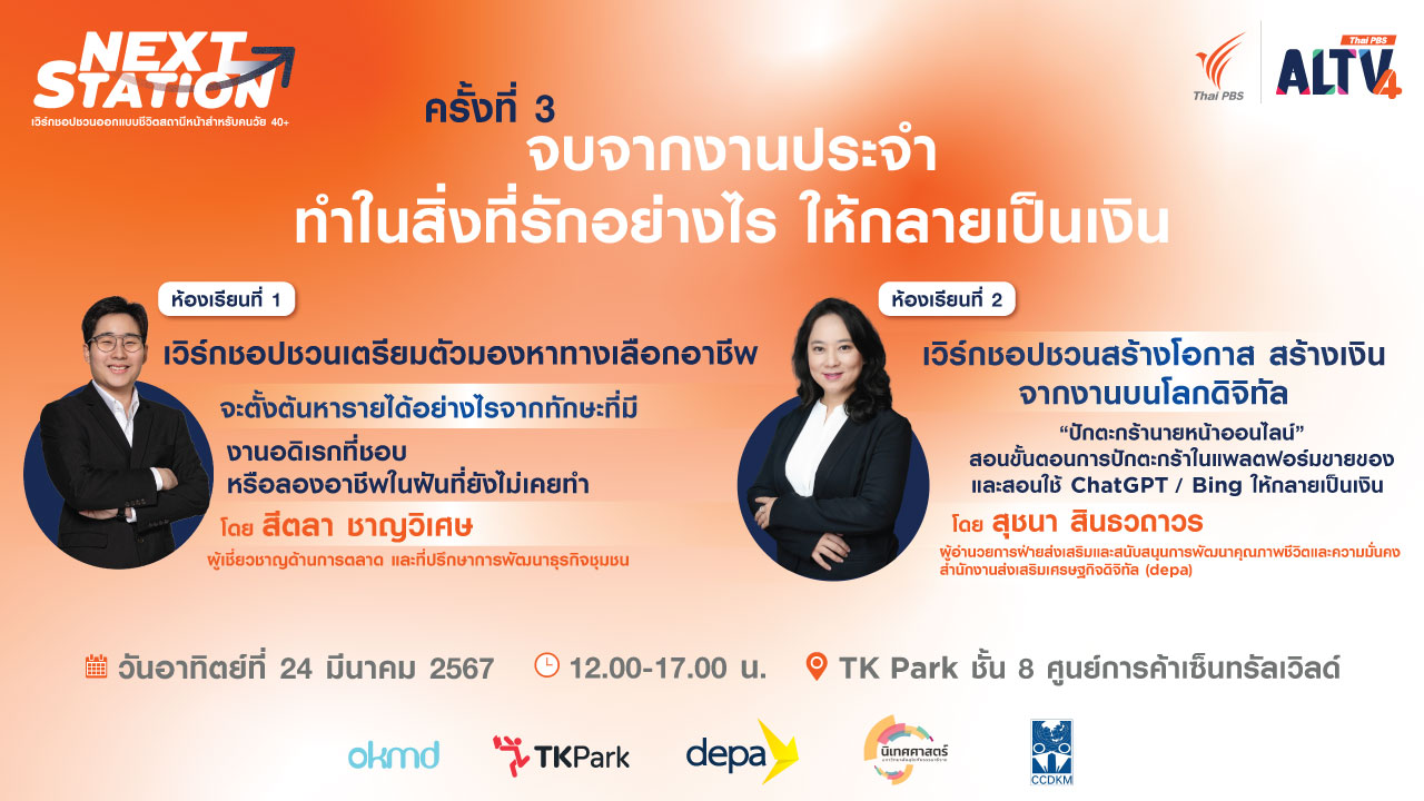 องค์การกระจายเสียงและแพร่ภาพสาธารณะแห่งประเทศไทย (ส.ส.ท.) หรือ ไทยพีบีเอส และ ALTV จับมือเหนียวแน่นกับภาคีเครือข่าย ได้แก่ OKMD, TK Park, depa, คณะนิเทศศาสตร์ มหาวิทยาลัยสุโขทัยธรรมาธิราช และ CCDKM หลักสูตรการเรียนรู้ออนไลน์ จัดงาน “Next Station เวิร์กชอปชวนออกแบบชีวิตสถานีหน้าสำหรับคนวัย 40+” อย่างต่อเนื่องครั้งที่ 3 ในหัวข้อ “จบจากงานประจำ ทำสิ่งที่รักอย่างไรให้กลายเป็นเงิน” ในวันที่ 24 มี.ค. 67
