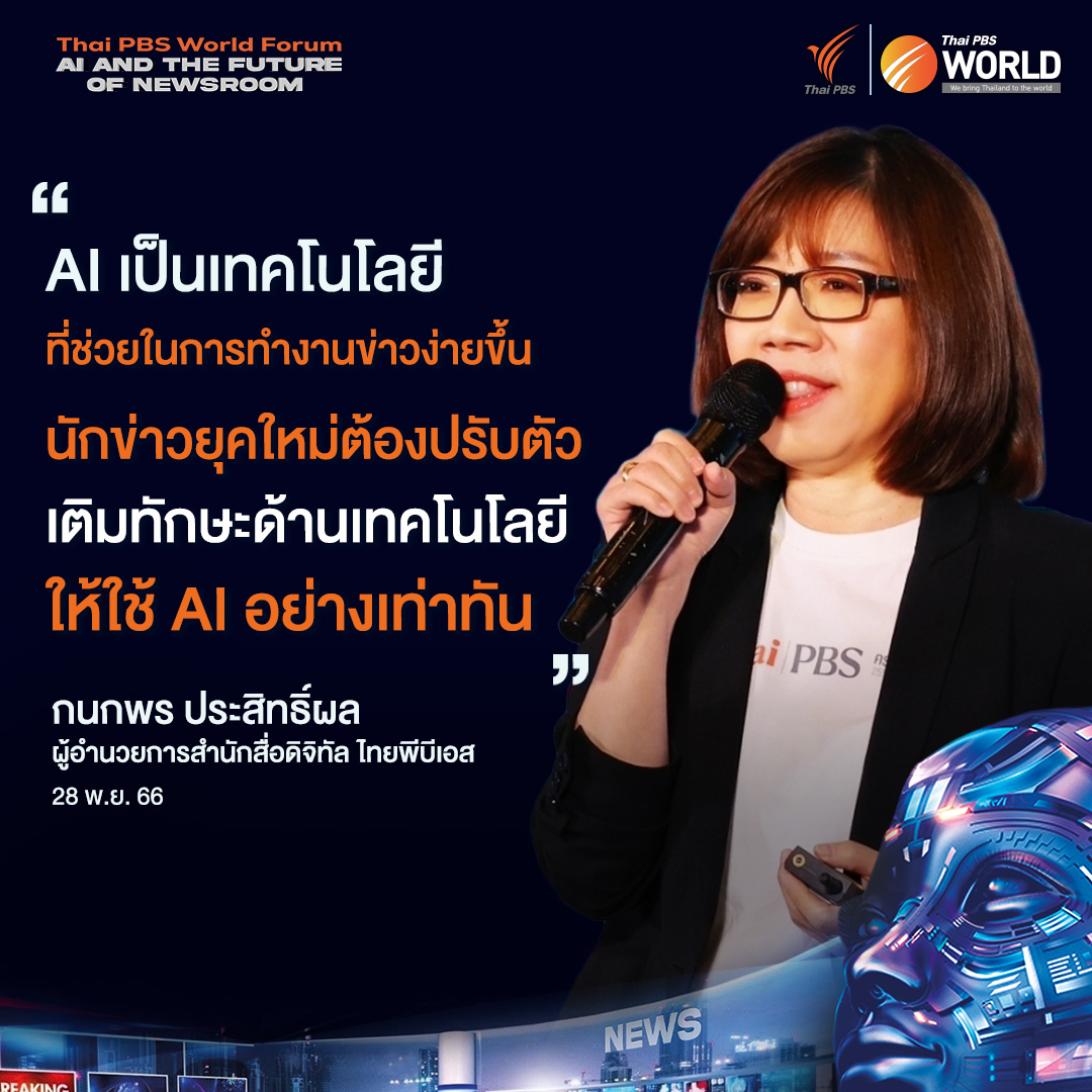 เมื่อวันที่ 28 พ.ย. 66 องค์การกระจายเสียงและแพร่ภาพสาธารณะแห่งประเทศไทย (ส.ส.ท.) หรือ ไทยพีบีเอส โดย Thai PBS World ร่วมกับองค์กรภาคีเครือข่าย Techsauce, สำนักงานนวัตกรรมแห่งชาติ (NIA), สถาบันวิจัยเพื่อการพัฒนาประเทศไทย (TDRI) และส่องสื่อ จัดงาน Thai PBS World Forum หัวข้อ “AI and the Future of Newsroom” เปิดพื้นที่ระดมความคิดแลกเปลี่ยนมุมมองกับองค์กรสื่อในระดับภูมิภาค เพื่อขับเคลื่อนทิศทางการทำงานสื่อมวลชนในอนาคต โดยมี ดร.สมเกียรติ ตั้งกิจวานิชย์ ประธานสถาบันวิจัยเพื่อการพัฒนาประเทศไทย (ทีดีอาร์ไอ) กล่าวเปิดงาน