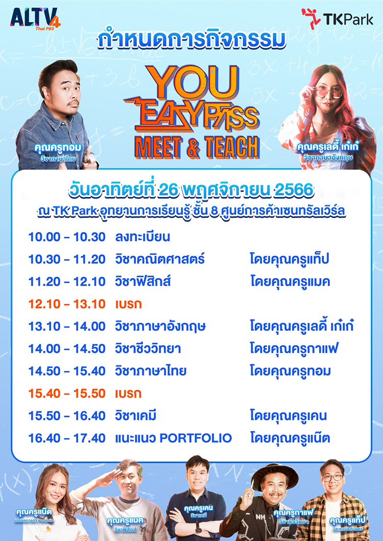 ALTV (Active Learning TV) จับมือ TK Park เปิดพื้นที่แห่งการเรียนรู้ เตรียมยกพลรวมพลังครั้งสำคัญของเหล่าติวเตอร์ชื่อดัง ที่จะมาเปิดคลาสเรียนสุด Exclusive พร้อมชวนน้อง ๆ นักเรียนชั้นประถมศึกษาตอนปลาย และชั้นมัธยมศึกษาตอนปลายทั่วประเทศ มาเปิดประสบการณ์นอกห้องเรียน เก็บเทคนิคการเตรียมตัวสอบฉบับเร่งรัดย่อยเนื้อหาให้เข้าใจง่าย พร้อมติวสอบโค้งสุดท้ายก่อนลงสนามจริง ในกิจกรรม “You Easy Pass Meet & Teach” อย่ารอช้าเตรียมปักมุดติวสอบเร็ว ๆ นี้ ลงทะเบียนเข้าร่วมฟรีที่หน้างาน พร้อมรับ Gift Set สุดพิเศษจาก ALTV ช่อง 4 ทีวีเรียนสนุก