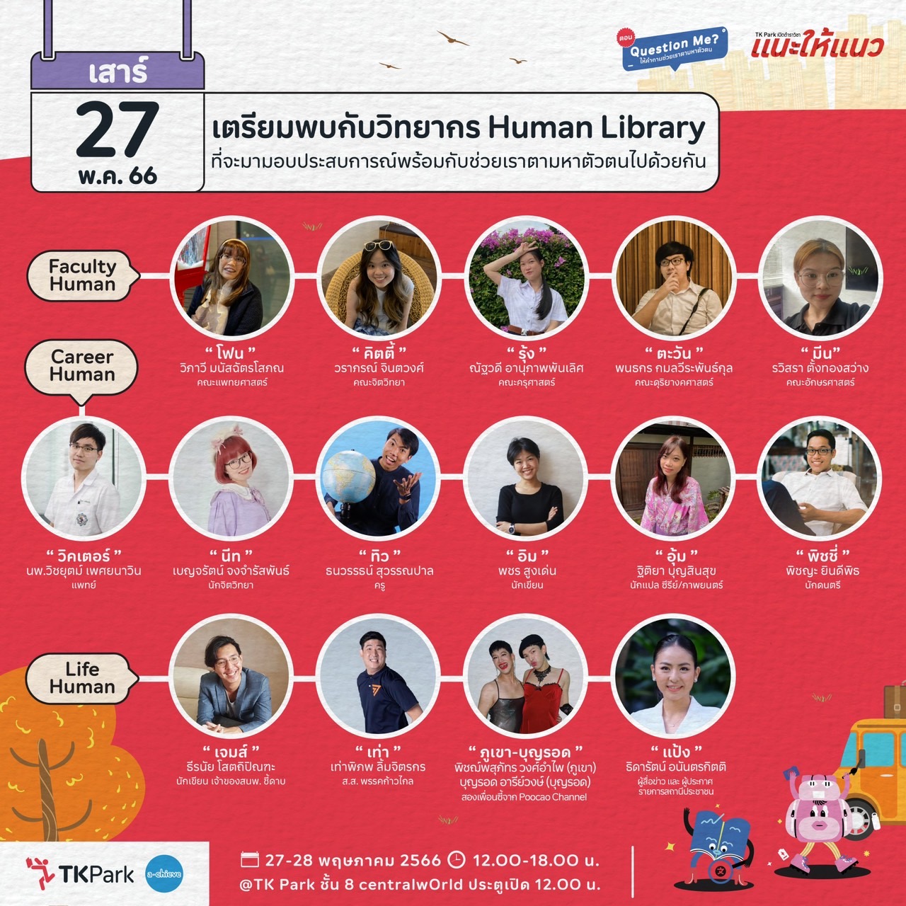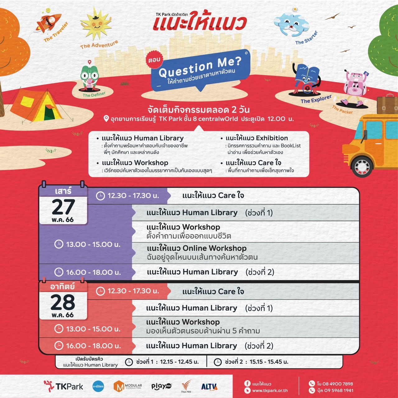 สำหรับน้อง ๆ เยาวชนที่สนใจ และกำลังมองหาพื้นที่และโอกาสในการค้นหาตัวเอง สามารถเข้าร่วมงาน “TK Park เปิดตำราวิชา แนะให้แนว ตอน Question Me?” ระหว่างวันที่ 27 – 28 พฤษภาคม 2566 เวลา 12.00 – 18.00 น. ณ อุทยานการเรียนรู้ TK Park ชั้น 8 ศูนย์การค้าเซ็นทรัลเวิลด์ กิจกรรมนี้ฟรี! ไม่เสียค่าใช้จ่าย ติดตามความเคลื่อนไหวและสมัครเข้าร่วมกิจกรรมได้ที่ FB Page : แนะให้แนว หรือสอบถามข้อมูลกิจกรรมเพิ่มเติม : 08 4900 7898 (โบ) / 09 5968 1941 (บุ๊ค)