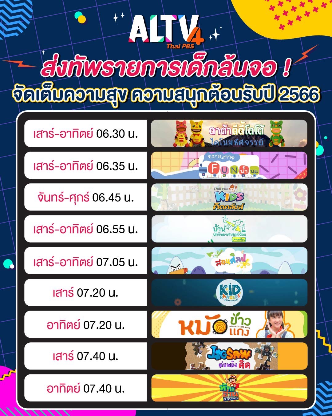 อัดแน่นความสนุกผ่านสุดยอดรายการเด็กตลอดทั้งปี ได้ทาง ALTV ช่อง 4 ทีวีเรียนสนุก หรือช่องทางออนไลน์ Website : www.altv.tv , Facebook : ALTV ช่อง 4 ทีวีเรียนสนุก , YouTube : ALTV4 และ LINE @ALTV4