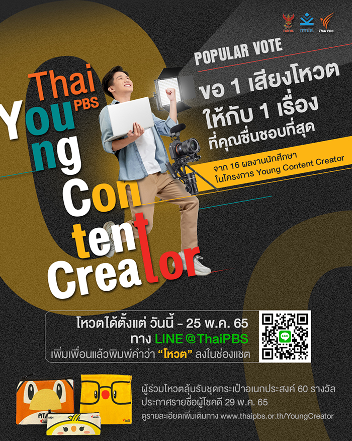ไทยพีบีเอสเปิดพื้นที่ชวนแฟน ๆ ร่วมตัดสินรางวัล Popular Vote เพื่อชิงทุนการศึกษามูลค่า 10,000 บาท จาก 16 ผลงานนักศึกษาที่ผ่านการคัดเลือกในโครงการ Thai PBS Young Content Creator โดยโหวต 1 ผลงานที่คุณชื่นชอบมากที่สุด ทาง LINE @ThaiPBS หมดเขตร่วมโหวต วันที่ 25 พ.ค.นี้