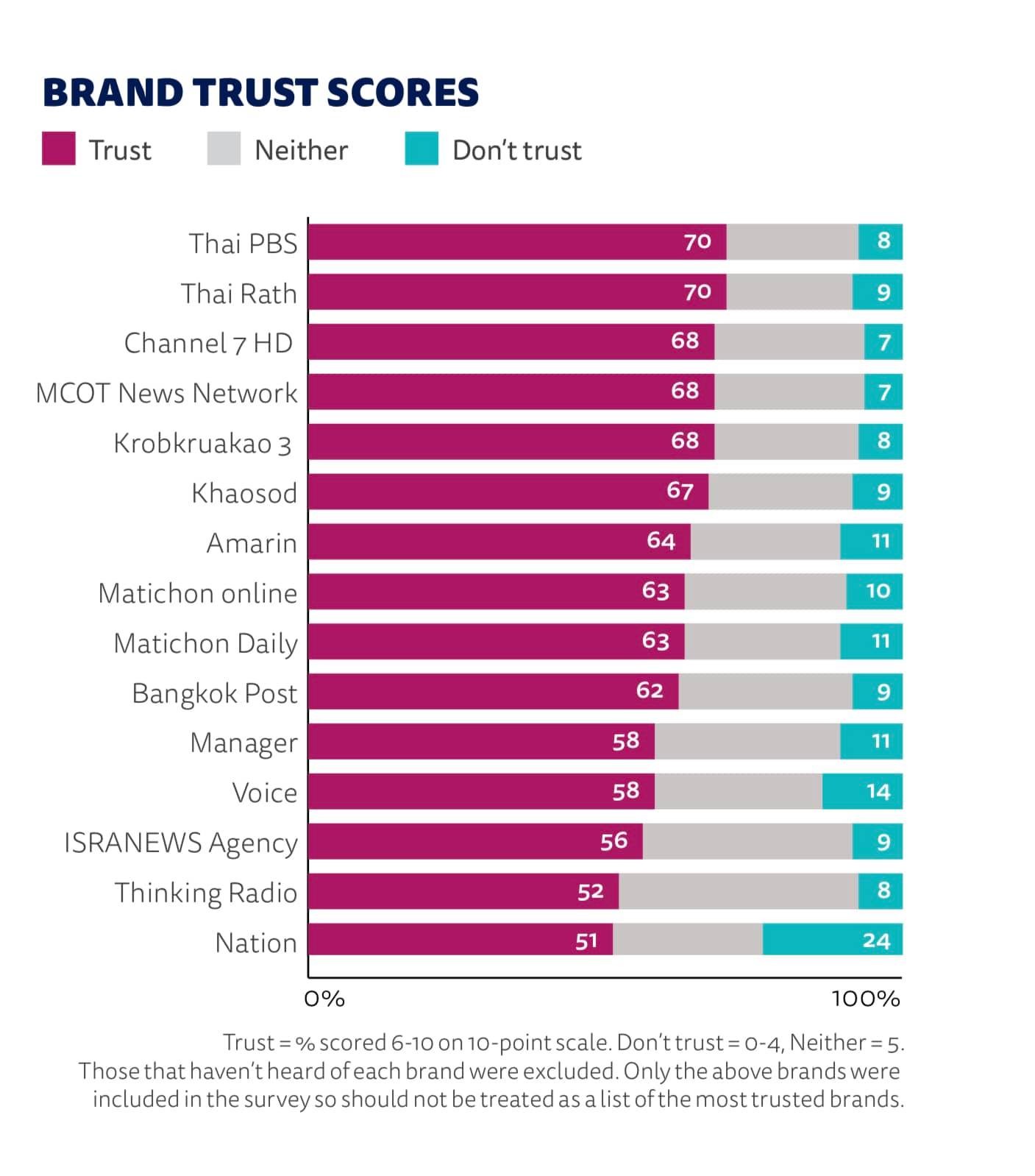 ไทยพีบีเอสได้รับความไว้วางใจในแบรนด์ (Brand Trust Scores) เป็นอันดับ 1 จากผลสำรวจ Digital News Report 2021 โดยสถาบันรอยเตอร์ที่ให้ YouGov บริษัทวิจัยทางการตลาดและวิเคราะห์ข้อมูลด้านอินเตอร์เน็ต เป็นผู้ทำการสำรวจและเก็บข้อมูลไปเมื่อเดือนมกราคม – กุมภาพันธ์ 2564 ที่ผ่านมา จากกลุ่มตัวอย่างที่สำรวจในประเทศไทย 2,015 คน ในขณะที่อันดับ 2 เป็นไทยรัฐ อันดับ 3 ช่อง 7 HD อันดับ 4 MCOT News Network และอันดับ 5 ครอบครัวข่าว 3 ที่ได้รับความไว้วางใจในแบรนด์ตามลำดับ