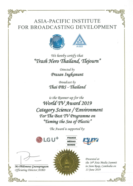 รายการสะเทือนไทย ตอน ทะเลจร #ธุรกิจพิชิตขยะ ได้รับรางวัลรองชนะเลิศ World TV Award 2019