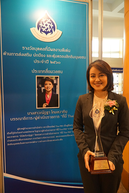 วันนี้ (14 ธ.ค.60) คุณณัฏฐา โกมลวาทิน ผู้ช่วยผู้อำนวยการสำนักข่าว สถานีโทรทัศน์ไทยพีบีเอส เข้ารับรางวัลเกียรติยศ “ผู้อุทิศตนเพื่อสิทธิมนุษยชน” รางวัลบุคคลและองค์กรที่มีผลงานดีเด่นด้านการส่งเสริม ปกป้อง และคุ้มครองสิทธิมนุษยชน ประจำปี 2560 ประเภทสื่อมวลชน จากสำนักงานคณะกรรมการสิทธิมนุษยชนแห่งชาติ ณ โรงแรมมิราเคิล แกรนด์ คอนเวนชั่น ในฐานะบรรณาธิการข่าวและผู้ดำเนินรายการ คุณณัฏฐา โกมลวาทิน ได้นำเสนอประเด็นการสนทนา การวิเคราะห์สถานการณ์และการแลกเปลี่ยนความคิดเห็นเรื่องสิทธิมนุษยชนในสถานการณ์ต่าง ๆ อย่างเจาะลึกและตรงประเด็น เป็นการส่งเสริมให้สังคมได้รับรู้สถานการณ์และตระหนักถึงความสำคัญของหลักสิทธิมนุษยชน