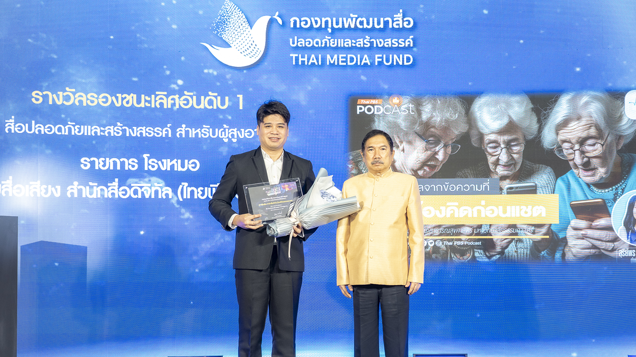 รางวัลที่สอง คือ รางวัลสื่อปลอดภัยและสร้างสรรค์สำหรับผู้สูงอายุ คว้ารองชนะเลิศ อันดับ 1 จากผลงานพอดแคสต์ “รายการโรงหมอ ตอนวัยเก๋า คิดก่อนแชต” รายการที่นำเสนอข้อมูลรอบด้านเกี่ยวกับสุขภาพ ทั้งโรคภัย อาการ ยา จิตแพทย์ เพศ ครอบครัว สุขภาพจิต โรคเกิดขึ้นใหม่ และเรื่องสุขภาพอีกมากมายจากแพทย์ผู้เชี่ยวชาญหลากหลายสาขาที่เล่าเรื่องเข้าใจยากให้ง่ายและเข้าใจมากขึ้น ซึ่งผู้สูงอายุ คือกลุ่มเปราะบางที่สุดที่มักได้รับผลกระทบค่อนข้างรุนแรงจากการได้รับหรือการพิมพ์ส่งต่อข้อความเหล่านั้น แม้บางครั้งเป็นเพียงข้อความสั้น ๆ แต่อาจส่งผลต่อความสัมพันธ์ระหว่างกลุ่มเพื่อนหรือครอบครัวของตัวเองได้ สำหรับผู้สูงอายุ จำเป็นต้องจัดการและเรียนรู้อะไรบ้างเกี่ยวกับการพูดคุยผ่านข้อความของเทคโนโลยียุคใหม่ โดยมีนายเชาว์วรรธณ์ พยัฆพันธ์ โปรดิวเซอร์อาวุโส Thai PBS Podcast จากสำนักสื่อดิจิทัล เป็นตัวแทนขึ้นรับรางวัล (คลิกฟังผลงาน)