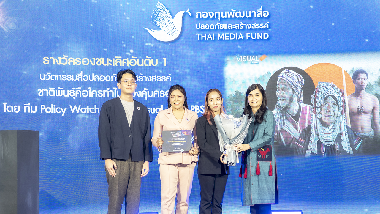 รางวัลแรก คือ รางวัลนวัตกรรมสื่อปลอดภัยและสร้างสรรค์ คว้ารองชนะเลิศ อันดับ 1 จากผลงาน “ชาติพันธุ์คือใคร ทำไมต้องคุ้มครอง” ซึ่งเป็นผลงานร่วมผลิตและสร้างสรรค์โดย Policy Watch จาก The Active ไทยพีบีเอส และ The Visual จากสำนักสื่อดิจิทัล ไทยพีบีเอส ที่ต่างมุ่งสร้างความเข้าใจเกี่ยวกับประเด็นชาติพันธุ์ของกลุ่มคนที่อาศัยอยู่เป็นกลุ่มเดียวกันหรือหลายกลุ่ม อันมีอัตลักษณ์และการสั่งสมทางวัฒนธรรม ภาษา วิถีชีวิต ภูมิปัญญา ความเชื่อ และวิถีชีวิตตามจารีตประเพณีร่วมกัน พร้อมส่งเสริมการเคารพในความหลากหลายทางสังคม โดยมีนางสาวทัศนีย์ ประกอบบุญ Transmedia Journalist และ ธนธร จิรรุจิเรข Data Analytic จาก The Active ไทยพีบีเอส พร้อมด้วย นางสาวพิมพ์ตะวัน แน่ประโคน เจ้าหน้าที่เนื้อหาดิจิทัล จากสำนักสื่อดิจิทัล เป็นตัวแทนรับรางวัล (คลิกชมผลงาน)