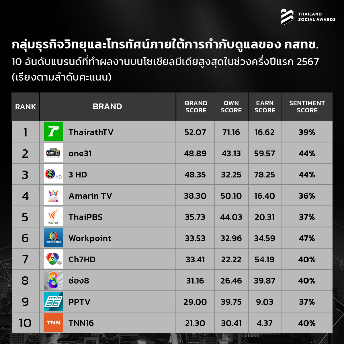 สำหรับ 10 อันดับ กลุ่มธุรกิจวิทยุและโทรทัศน์ภายใต้การกำกับดูแลของ กสทช. ที่ทำผลงานบนโซเชียลมีเดียสูงสุดในช่วงครึ่งปีแรก 2567 มีดังนี้