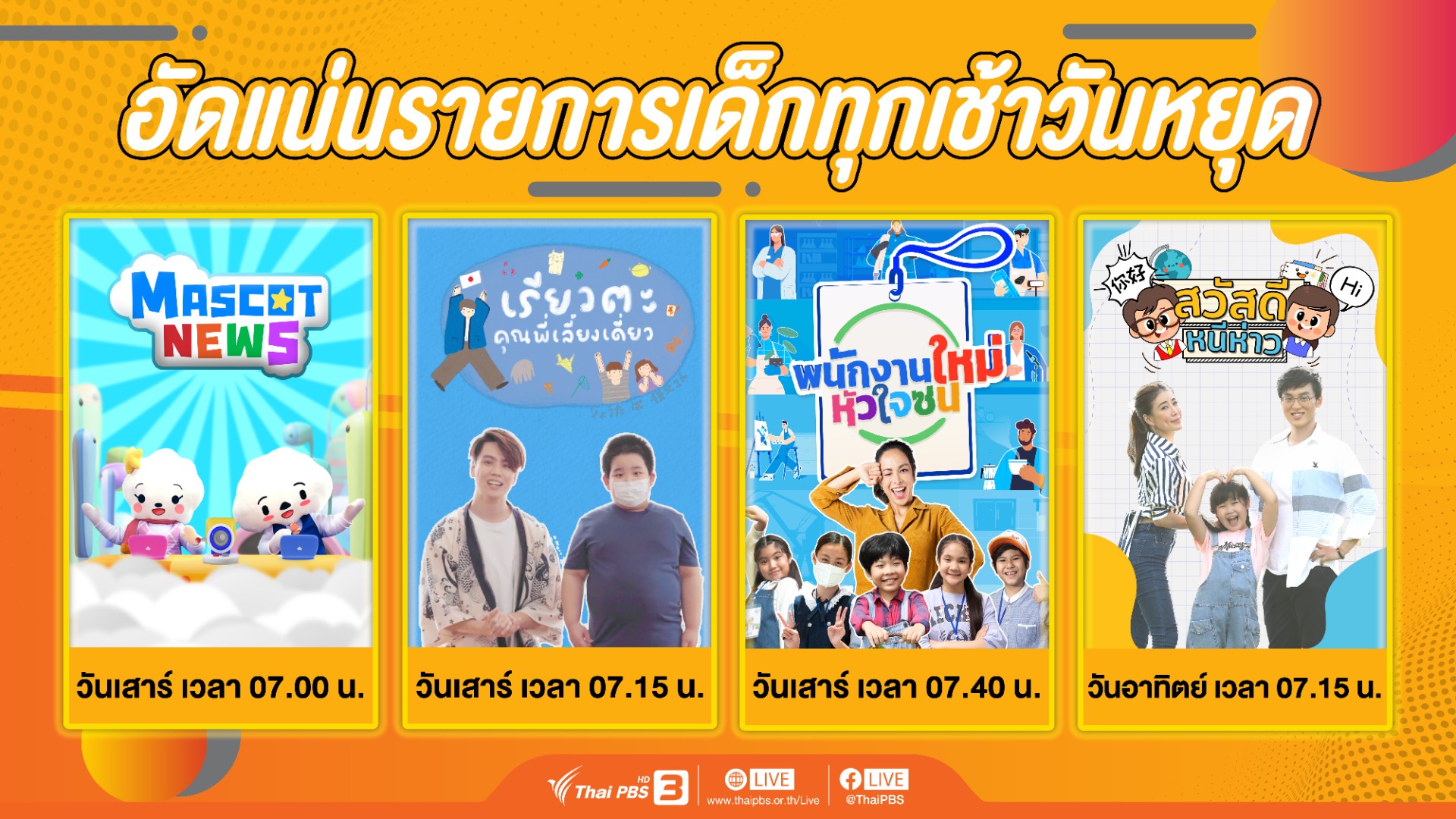 สนุกสดชื่นกับรายการสำหรับน้อง ๆ หนู ๆ รับอรุณ กับรายการ “Mascot News” วันเสาร์ เวลา 07.00 น. สนุกไปกับเจ้าเมฆจอมซน “Clouden” และ “Cloudy” ที่คอยส่องกล้องจาก Sky City เพื่อไปหาข่าวดี ๆ มาเล่าให้ทุกคนได้ฟังอย่างเข้าใจง่ายและเข้าถึงได้ในยามเช้า