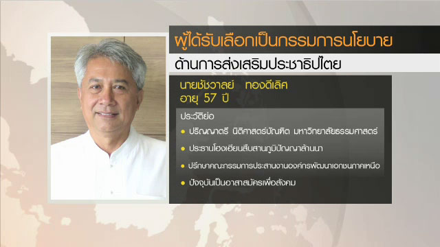 - ด้านการส่งเสริมประชาธิปไตยฯ คือ นายชัชวาลย์ ทองดีเลิศ
