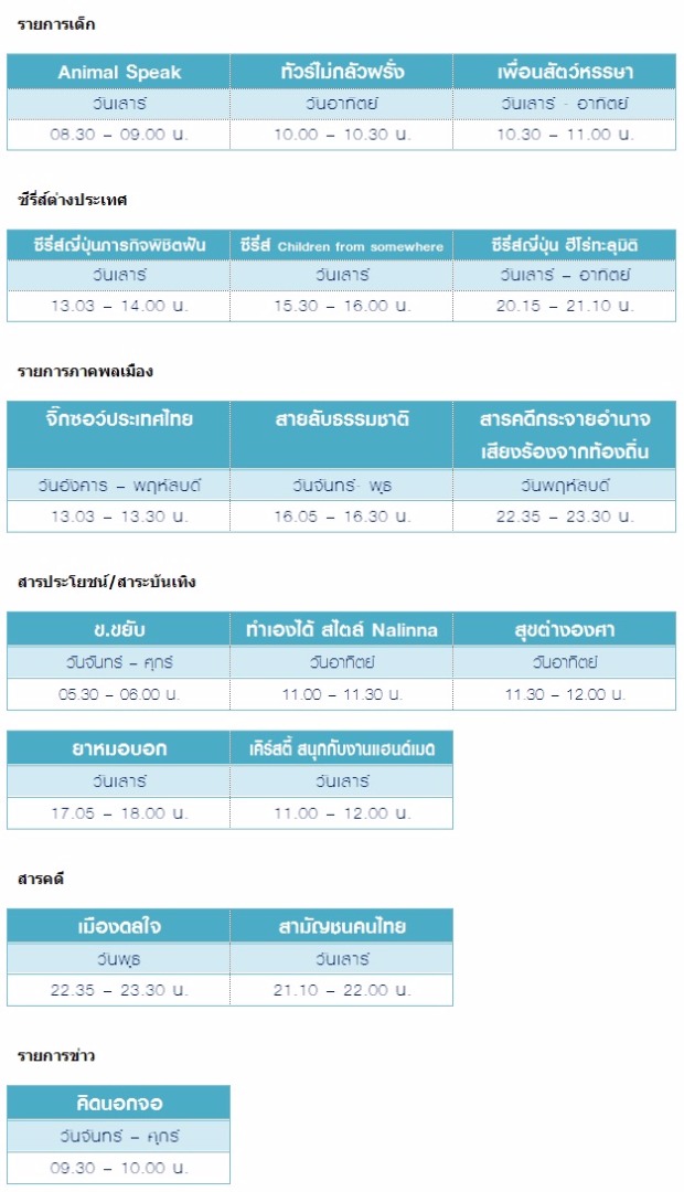 ในส่วนของผังรายการ วันเสาร์ – อาทิตย์ เป็นเวลาของทุกคนในครอบครัว กับรายการสำหรับเด็ก, เยาวชน, ครอบครัว, การศึกษา และสารคดีคุณภาพสูงหลากรสชาติ ทั้งต่างประเทศ และผู้ผลิตฝีมือคนไทย เพื่อเป็นทางเลือกใหม่ให้กับผู้ชมอีกด้วย”