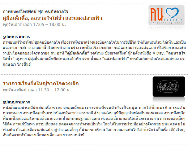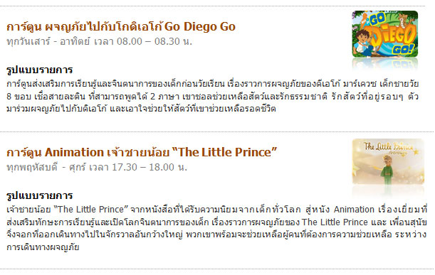 สถานีโทรทัศน์ไทยพีบีเอส นำร่องเสนอรายการด้วยระบบเสียงบรรยายภาพ (Audio Description) 6 รายการ ได้แก่ ละครชุด คนบันดาลใจ 3 เรื่อง คือ คู่มือเด็กดื้อ, ลมหายใจใต้น้ำ และแสงปลายฟ้า, รายการเรื่องยิ่งใหญ่จากใจดวงเล็ก, ภาพยนตร์ต่างประเทศ วันหยุดนักขัตฤกษ์, รายการข้างหลังเพลง, รายการครอบครัวเดียวกัน, ชุดการ์ตูน คือ ดอร่า (Dora the Explorer), ผจญภัยไปกับโกดิเอโก้ Go Diego Go และเจ้าชายน้อย (The Little Prince)