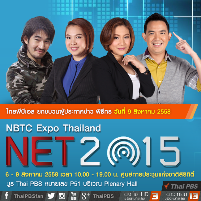 ไทยพีบีเอส เชิญชวนร่วมงาน NBTC Expo Thailand : NET 2015 ก้าวสู่อนาคตโลกดิจิตอล The Future Trend in Digital World ระหว่างวันที่ 6 – 9 สิงหาคม เวลา 10.00 – 19.00 น. ศูนย์การประชุมแห่งชาติสิริกิติ์ พบกับบูธไทยพีบีเอสได้ที่ P51 Plenary Hall 3 ภายในงานพบกับ กิจกรรมทดลองอ่านข่าวกับผู้ประกาศข่าวมืออาชีพ ด้วยเทคนิคการนำเสนอข่าวเสมือนจริง (Immersive Graphic) และครั้งแรกกับประสบการณ์ห้องมืด เพื่อเรียนรู้ระบบเสียงบรรยายภาพสำหรับผู้พิการทางสายตา (Audio Description) พร้อมพบกับพิธีกร ผู้ดำเนินรายการ ผู้ประกาศข่าว อาทิ บอย AF- สิทธิชัย ผาบชมพู, บอล-ยอดจากรายการหนังพาไป,ฟูจิ ฟูจิซากิ จากรายการดูให้รู้, เต๋า-ณัฐฐา โกมลวาทิน, จอร์ช-วราวิทย์ ฉิมมณี มาร่วมสนุกเล่นเกมแจกของรางวัลมากมาย
