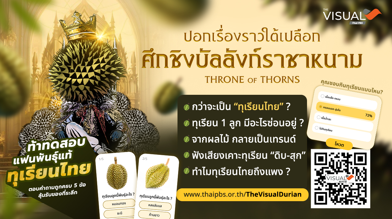 เปิดศึกชิงบัลลังก์ราชาหนาม THRONE OF THORNS เป็นผลงานชิ้น Masterpiece ของ The Visual By Thai PBS ที่ทีมงานทุกคนความทุ่มเทในทุกรายละเอียดของชิ้นงาน ผ่านกระบวนการวิเคราะห์ ออกแบบภาพ Infographic เล่าเรื่องด้วยเทคนิค Data Storytelling นำเสนอในรูปแบบของ Data Visualization ผสมผสานเทคโนโลยี AI ช่วยเล่าให้ฟัง บอกเล่าเรื่องราว วิวัฒนาการของทุเรียนตั้งแต่อดีตจนถึงปัจจุบัน ใช้สื่อผสมในรูปแบบที่น่าสนใจและหลากหลาย โดยการนำสถิติ ตัวเลข ข้อมูลในด้านวิชาการ นำมาย่อยและเรียบเรียงใหม่ให้เข้าใจง่าย