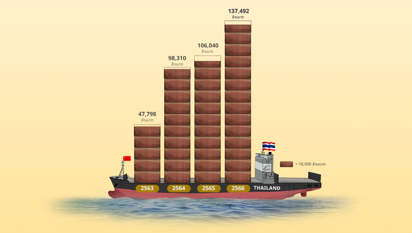 ทิศทางราคาของทุเรียนมีแนวโน้มเพิ่มขึ้นอย่างต่อเนื่อง และกลายเป็นที่ต้องการของตลาดสูง ทุเรียนเป็นสินค้าเกษตรส่งออกอันดับ 2 ของไทย ข้อมูลระหว่างปี 2562 – 2566 ระบุว่า มูลค่าส่งออกทุเรียนสูงขึ้นอย่างรวดเร็ว ในปี 2567 ไทยส่งออกทุเรียนไปจีนมากที่สุดถึง 97.48 % รวมมูลค่ากว่า 108,000 ล้านบาท และขยับขึ้นแบบก้าวกระโดดในทุก ๆ ปี