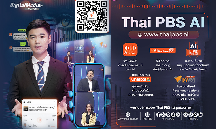 AI Anchor อัปเดตข่าว สาระความรู้กับผู้ประกาศข่าว AI ที่มีความสมจริงเป็นธรรมชาติ ภาพและเสียงคมชัด มีความแม่นยำสูง ชมสดเต็มตา เต็มจอ ไปกับ AI LIVE Vertical ปรับมุมมองแนวตั้งสำหรับ Smartphone พร้อมบริการ Thai PBS Chatbot ที่จะทำให้ชีวิตของคุณง่ายขึ้น ค้นหาคำตอบตามที่คุณต้องการด้วย chatbot สุดยอดผู้ช่วยอัจฉริยะ