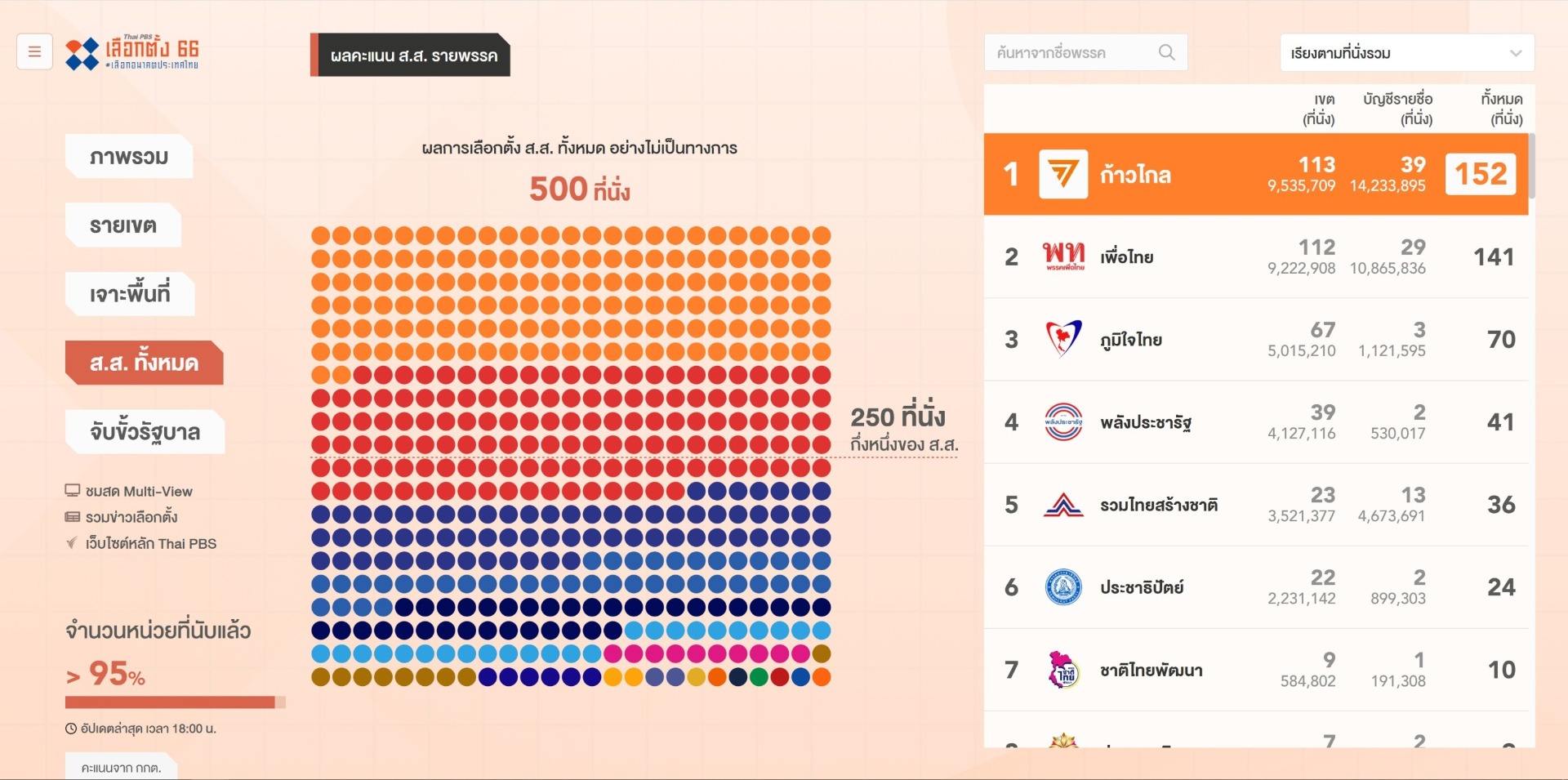 ทั้งนี้ ไทยพีบีเอส ขอขอบคุณสำหรับการติดตามทุกช่วงของการรายงานข่าว และผลคะแนนเลือกตั้ง 14 พฤษภาคม รวมถึงทุกข้อคิดความเห็น เสนอแนะติชมในทุกช่องทาง ท่านยังสามารถติดตามผลคะแนนเลือกตั้ง 2566 จนกว่าจะมีการประกาศคะแนนอย่างเป็นทางการจาก กกต. ได้ที่ www.thaipbs.or.th/Election66 และสามารถติดตามทุกผลงานได้ทาง ไทยพีบีเอส ช่องหมายเลข 3 และทางออนไลน์