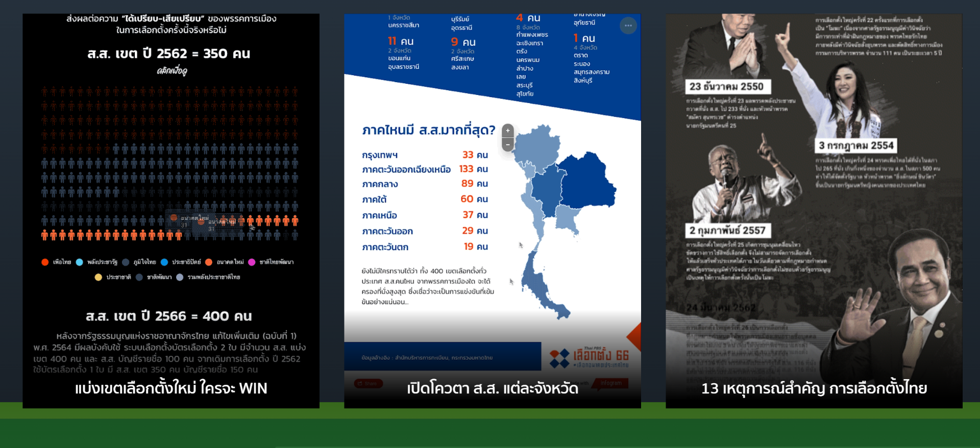 การนำเสนอข้อมูลและเนื้อหาความรู้ในมุมมองที่หลากหลายในการเลือกตั้ง 66 ในรูปแบบของมัลติมีเดีย เล่าเรื่องผ่านเทคนิค Visualization ให้มีความต่อเนื่องและน่าสนใจด้วย Interactive เลือกใช้สื่อผสมทั้งบทความ ภาพนิ่ง และภาพเคลื่อนไหว