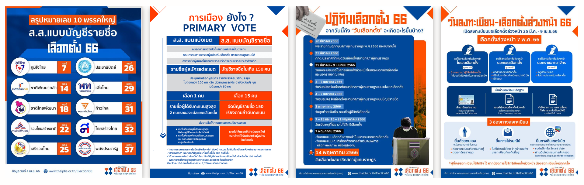 ไทยพีบีเอสในฐานะสื่อสาธารณะ ได้เปิดตัวเว็บไซต์ www.thaipbs.or.th/Election66 เกาะติดสถานการณ์ครบทุกด้าน พร้อมนำเสนอ 7 บริการพิเศษหลากหลายรูปแบบเพื่อคนไทย ชู Data Viz เป็นจุดเด่นนำเสนอข้อมูลเพื่อการเลือกตั้งในรูปแบบมัลติมีเดีย พร้อมบริการคำศัพท์การเมืองในรูปแบบภาษามือเพื่อคนหูหนวก ตามจุดยืนการเลือกตั้งอย่างเท่าเทียม (Election for All)