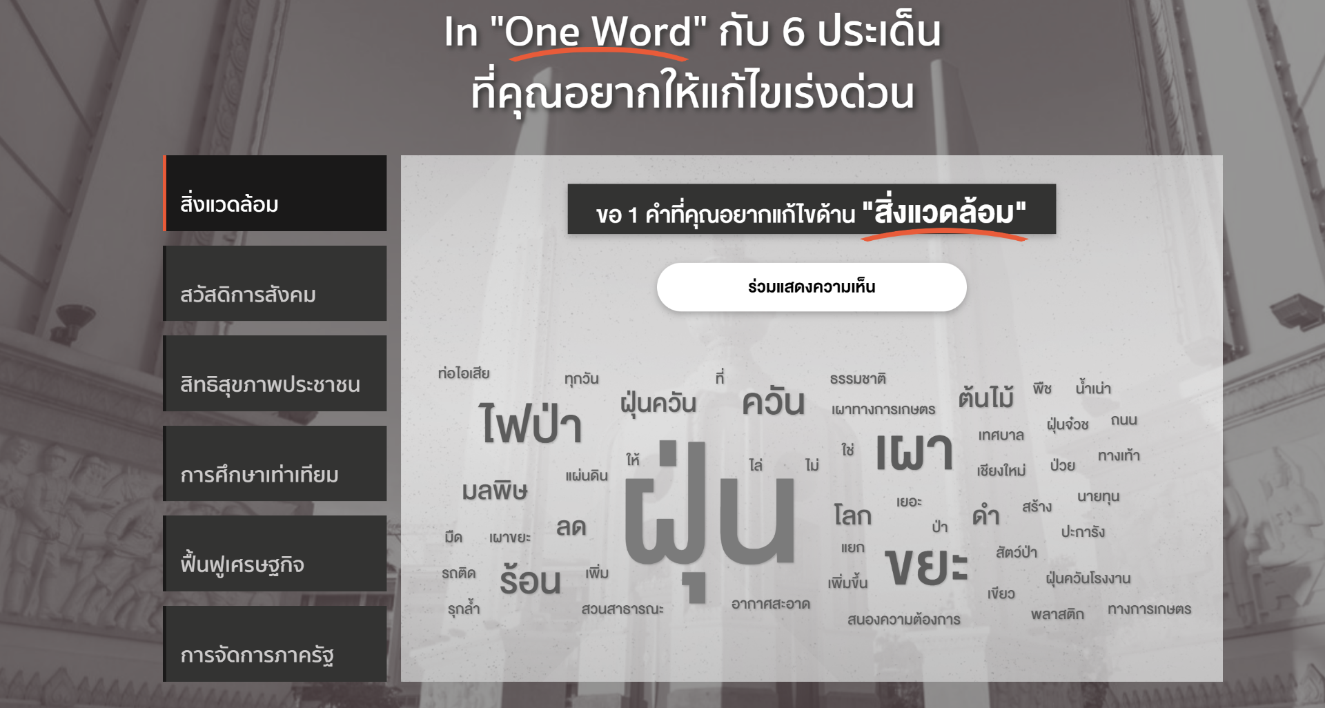 เน้นการเป็นพื้นที่สื่อกลางให้ประชาชนได้เสนอความเห็น ส่งต่อความคิด และสะท้อนมุมมองในเรื่องราวต่าง ๆ ในกิจกรรมต่าง ๆ อาทิ “ขอ 1 คำ” เพื่อฝากข้อความเหล่านี้เป็นเสียงสะท้อนไปยังนักการเมืองทุกพรรคให้ใช้ขับเคลื่อนนโยบายบริหารประเทศต่อไป