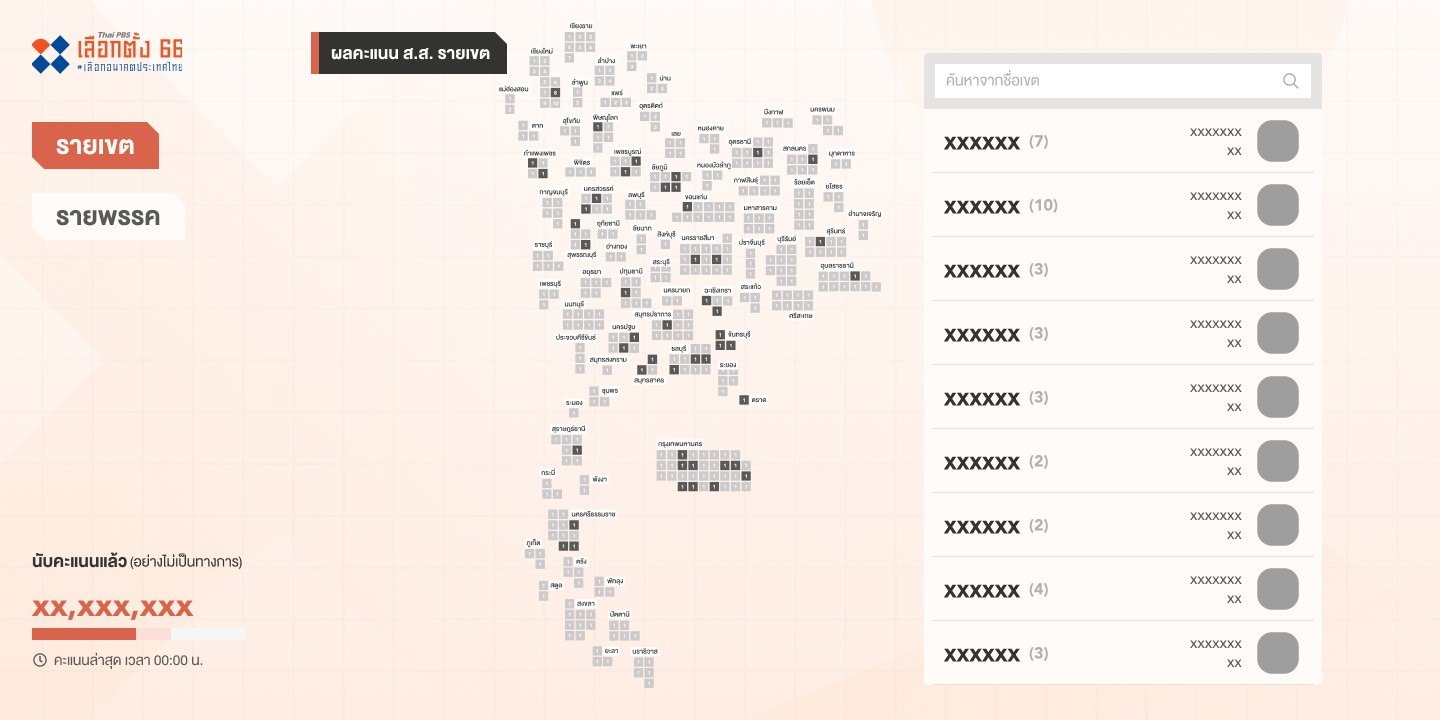 การรายงานผลคะแนนเลือกตั้ง (อย่างไม่เป็นทางการ) ในมิติต่าง ๆ สดนาทีต่อนาที ร่วมลุ้นผลการเลือกตั้งแบบ Interactive รองรับทุกอุปกรณ์ ด้วยความร่วมมือในการรายงานผลคะแนนเลือกตั้งร่วมกับ 50 องค์กร และอาสาสมัครนับคะแนนจากทั่วประเทศ