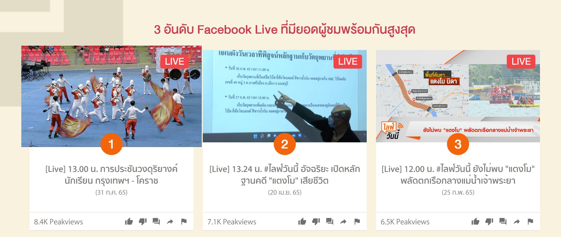 - วันที่มีการเข้าชมสดออนไลน์สูงสุด วันที่ 22 พฤษภาคม 2565 จำนวน 23,368 Views เป็นการชมเนื้อหาข่าวการเลือกตั้งผู้ว่ากรุงเทพมหานคร ในรายการข่าวค่ำมิติใหม่