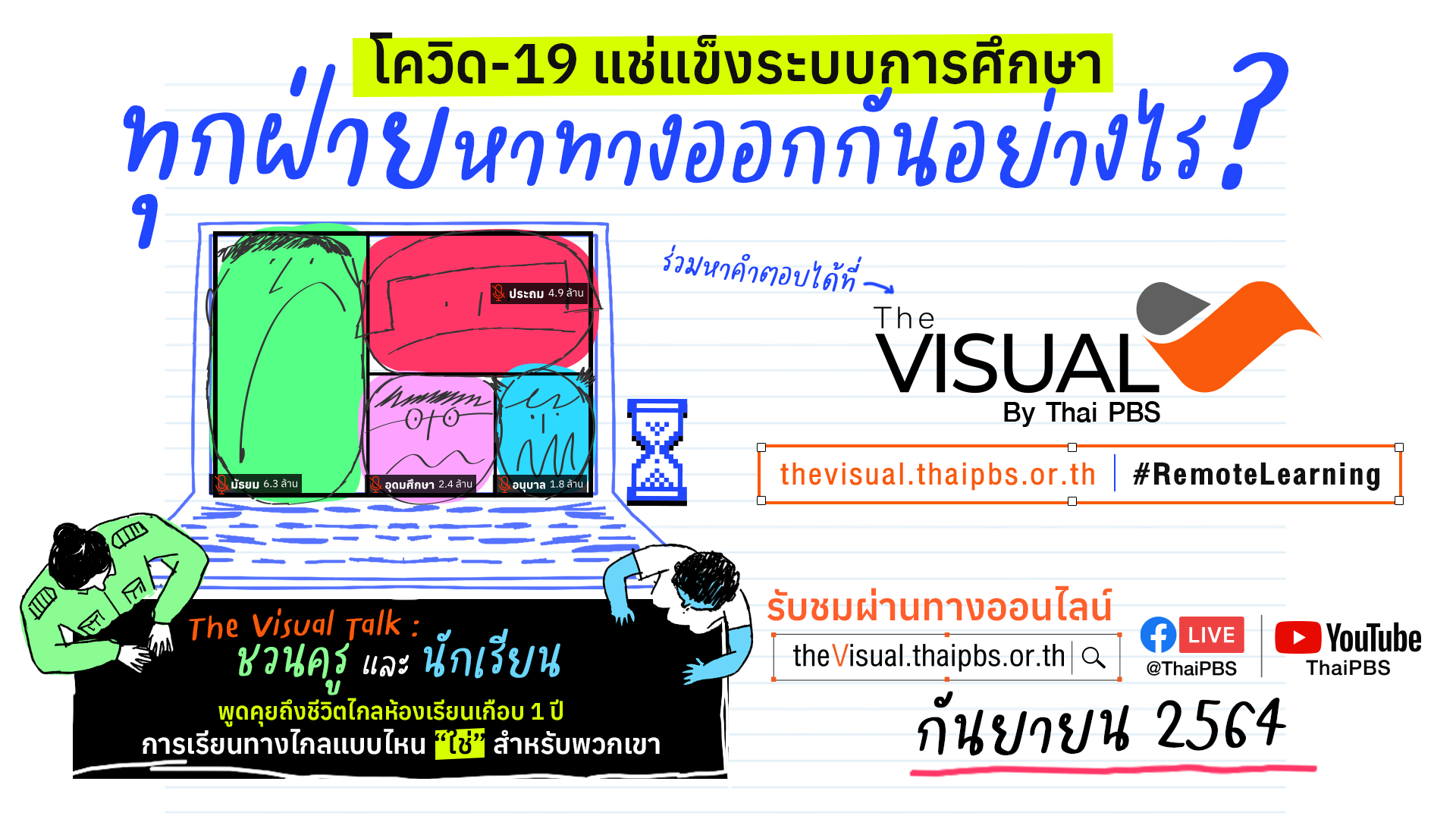 และปิดท้ายในเดือนกันยายน 2564 กับวงเสวนาชวนพูดคุยถึงชีวิตไกลห้องเรียนของเด็กและคุณครู ใน The Visual Talk : ทางรอดการศึกษาไทย..ปรับตัวอย่างไร ? ในยุคโควิด-19 ติดตามกิจกรรมทั้งหมดนี้ได้ที่ Website : TheVisual.thaipbs.or.th , Facebook : @ThaiPBS และ YouTube : Thai PBS