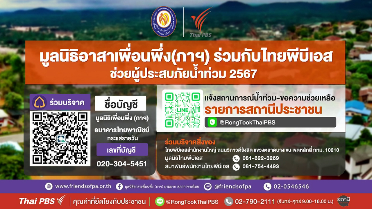 เกาะติดสถานการณ์น้ำท่วม เตรียมรับมือเฝ้าระวังน้ำท่วมฉับพลันทั่วประเทศ ติดตามสถานการณ์น้ำท่วม 2567 ได้ที่ www.thaipbs.or.th/Flood67 แจ้งสถานการณ์น้ำท่วมหรือขอความช่วยเหลือได้ที่ รายการสถานีประชาชน และร้องทุกข์ลงป้ายนี้ ไทยพีบีเอส ได้ทาง LINE @RongTookThaiPBS โทร. 02-790-2630-2, 02-790-2111 (ทุกวันจันทร์ – ศุกร์ เวลา 09.00 – 16.00 น.) หรือ สายด่วน ปภ. 1784 (ทั่วประเทศ 24 ชม.)