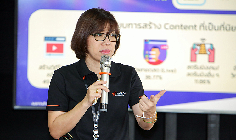 หลังจากนั้น นางสาวกนกพร ประสิทธิ์ผล ผู้อำนวยการสำนักสื่อดิจิทัล ไทยพีบีเอส บรรยายเกี่ยวกับความก้าวหน้าของเทคโนโลยีการสื่อสารและสื่อยุคใหม่ และต่อด้วยการให้ข้อมูลเกี่ยวกับวิธิผลิตพอดคาสต์ในแนวทางของไทยพีบีเอส ซึ่งเน้นการใช้ “เสน่ห์ของเสียง” เล่าเรื่อง โดยทีมงานฝ่ายสื่อเสียง